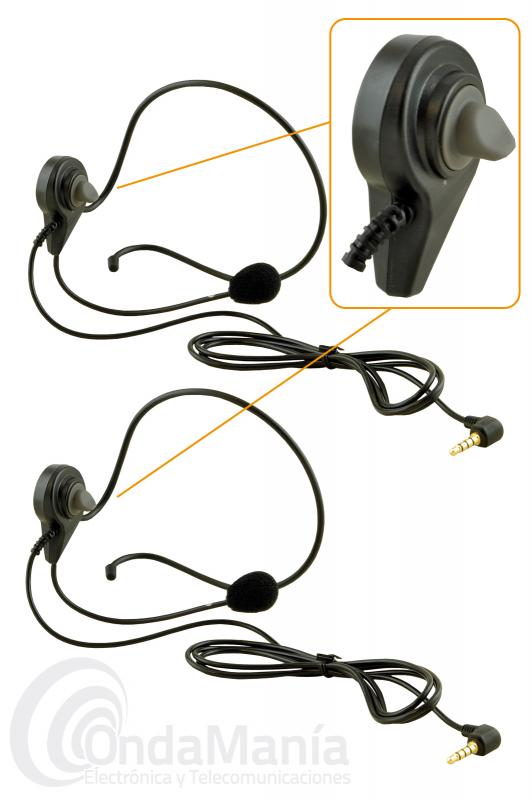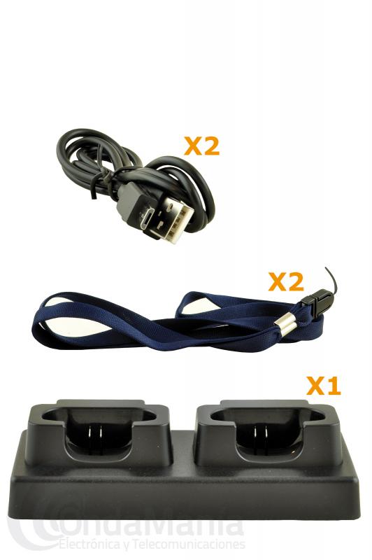 Accesorios suministrados: 2 intercomunicacdores, 2 microauriculares, 2 colgantes para el cuello, cable USB para carga de batería, cargador de baterías de sobremesa doble y manual de instrucciones en castellano.