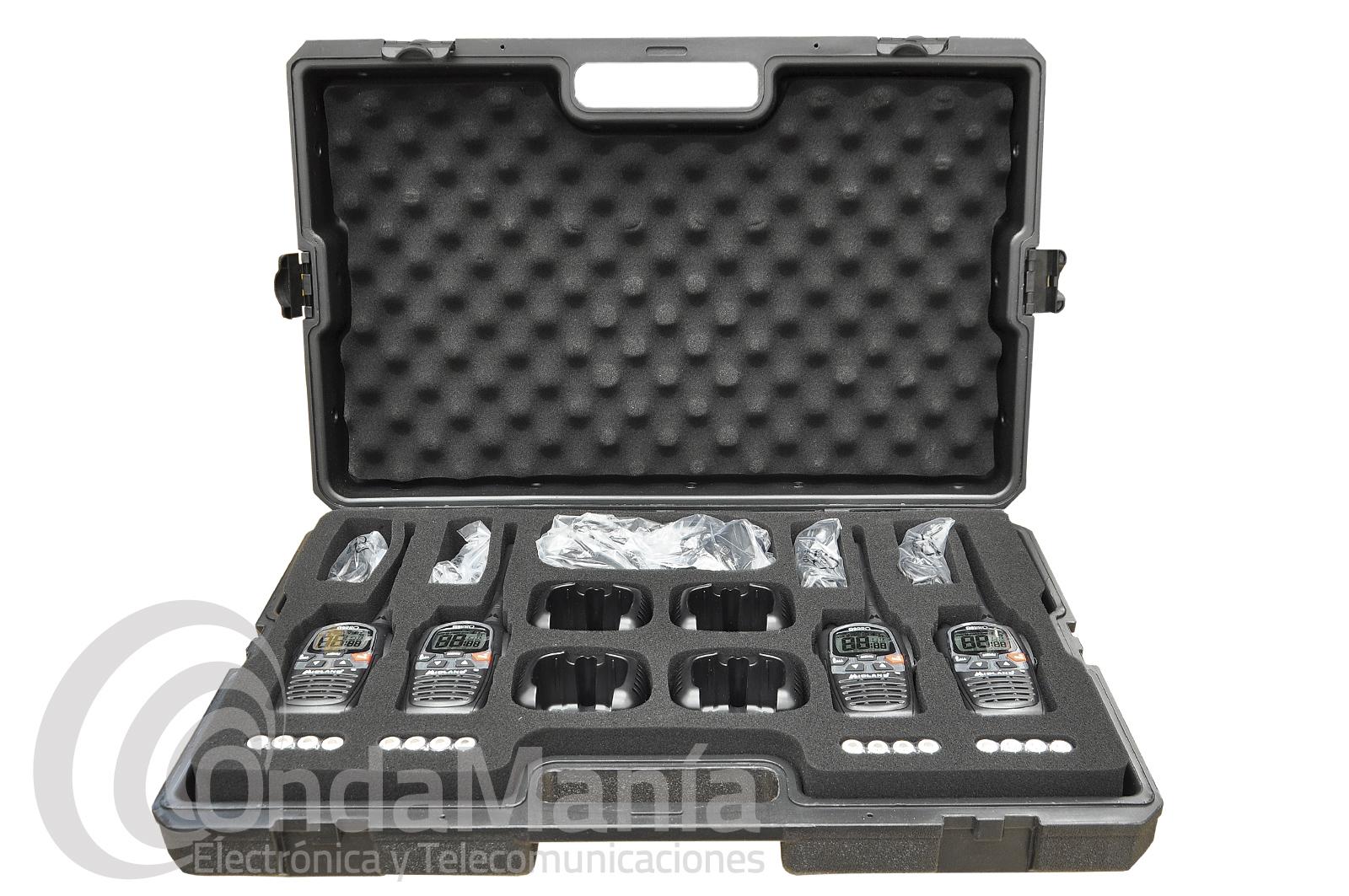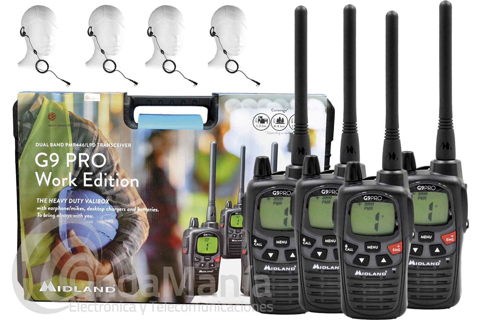 La maleta con 4 PMR-446 Midland G9 PRO WORK EDITION contiene todo lo que necesitas para comunicarte en entornos de trabajo, incluye un maletín exclusivo y casi indestructible, fácil de transportar de un lado para otro, los Midland G9 PRO WORK EDITION incluyen funciones como: Dual PTT, side tone, audio profesional, 38 CTCSS, 104 códigos DCS, dual watch, vibracall, vox, scan,...