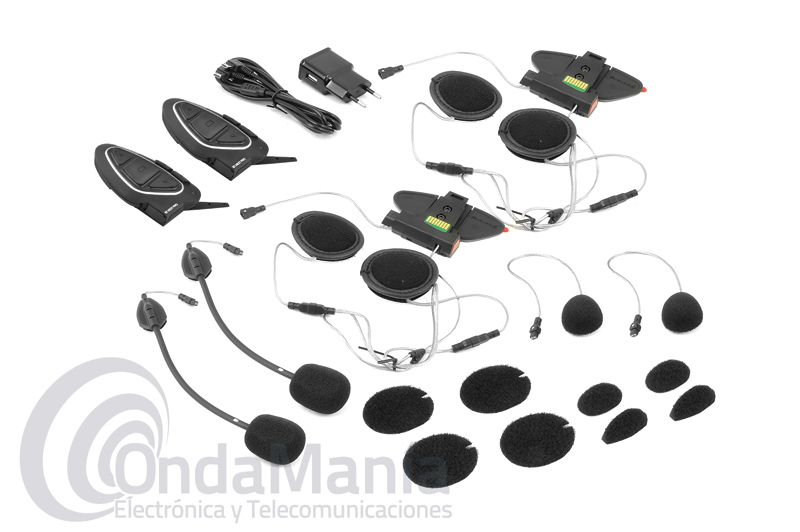 Contenido: 2 BT NEXT PRO, 2 kit de audio con altavoces HI-FI estéreo, 2 kit de micrófonos intercambiables: hilo y brazp flexible, 2 kit "slide-in" de fijación al casco: con biadhesivo o con mordaza, 1 cargador con doble cable USB.