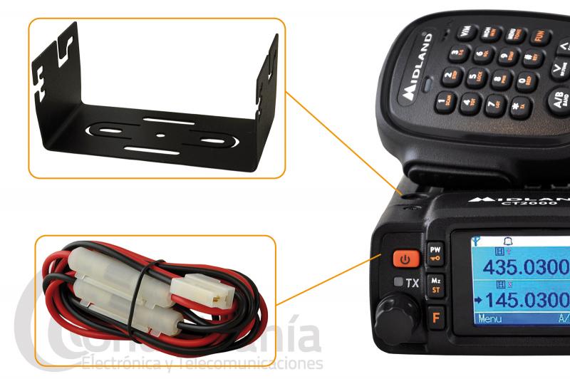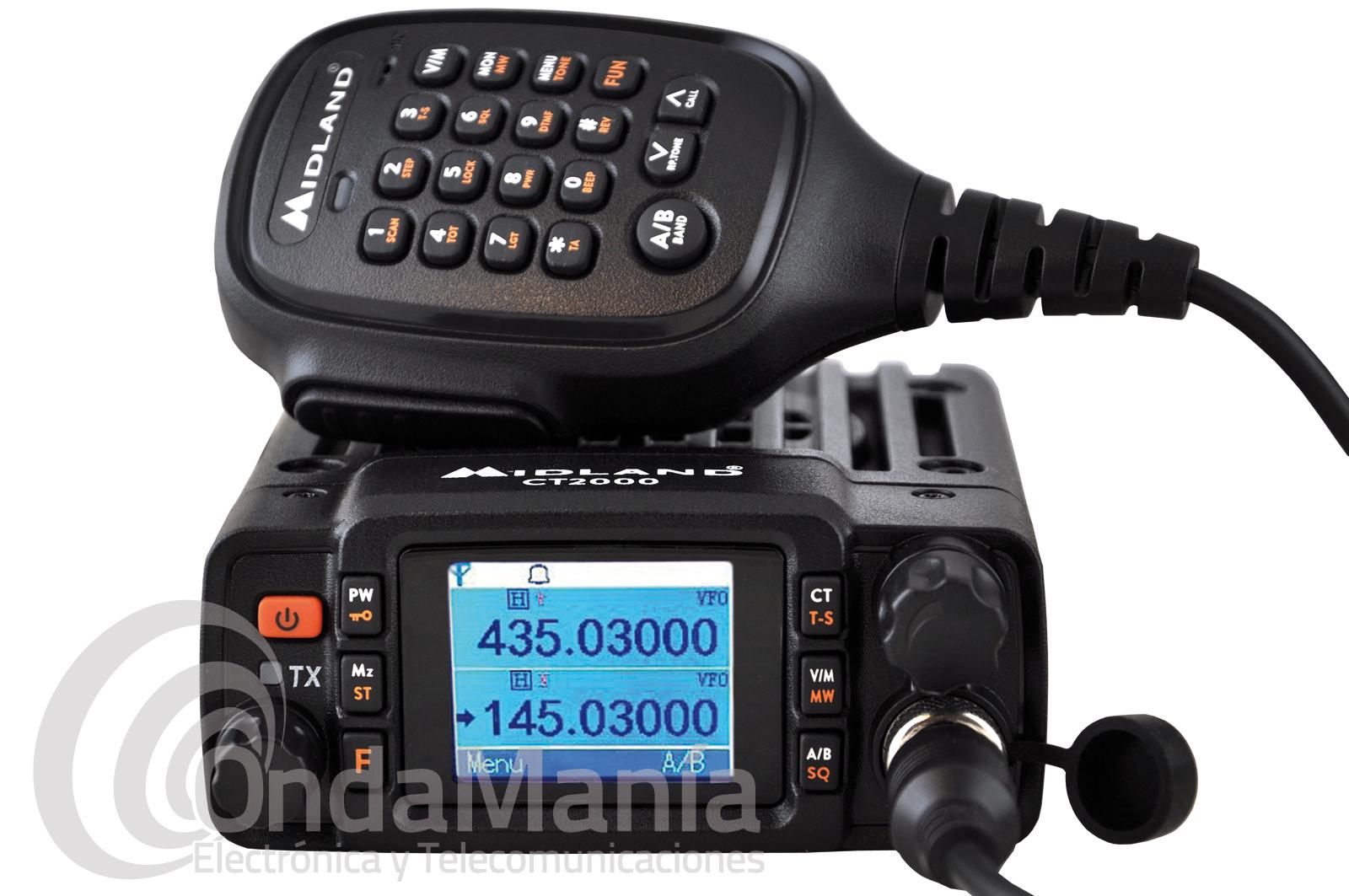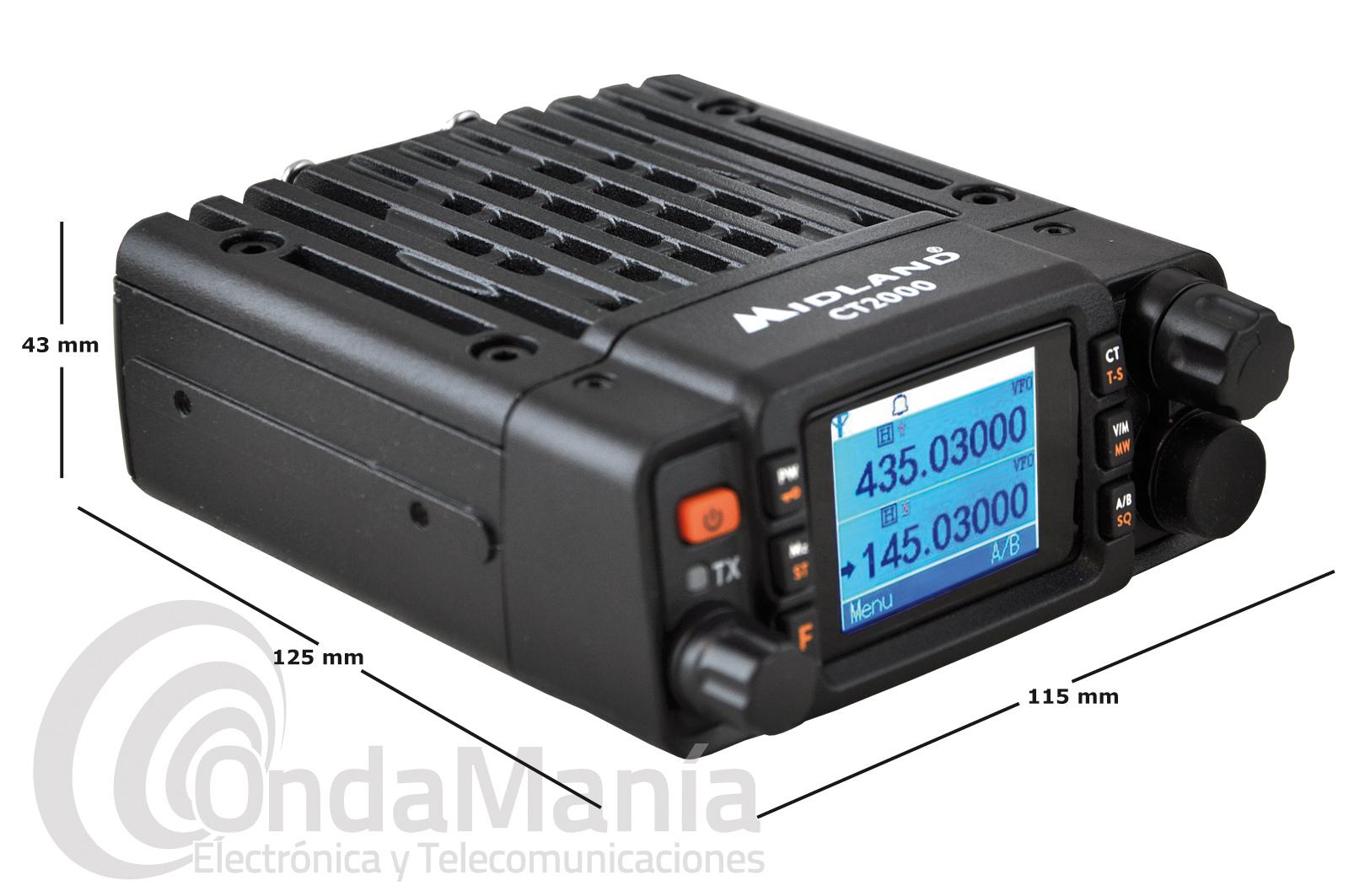 Emisora doble banda Midland CT-2000 con múltiples funciones y un tamaño reducido, 203 canales, 25 W de potencia, display gráfico multicolor, altavoz con 3 W de potencia y función Audio Extra Clear, micrófono multifuncion con teclado DTMF, tonos CTCSS y DCS, protección IP54 a prueba de agua y polvo, función escaner,...