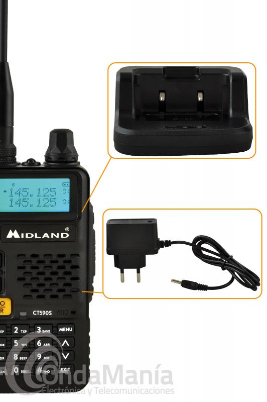 El pack incluye: 1 transceptor Midland CT-590S, clip de cinturón, pack de batería de Li-Ion con 1500 mAh, cargador rápido de sobremesa, adaptador de corriente y antena.