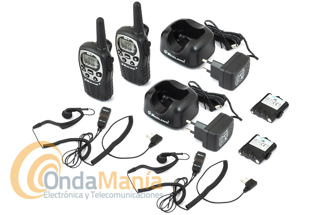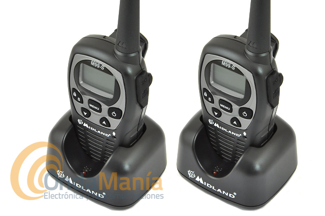 Pareja de PMR Midland M99S Plus nueva versión 2013 con 99 canales "Comunicación libre sin coste adicional" incluyen baterías recargables, cargadores individuales de sobremesa, dos microfono auriculares (pinganillos) con posibilidad de VOX o PTT, timbre de llamada, roger beep, CTCSS,....
