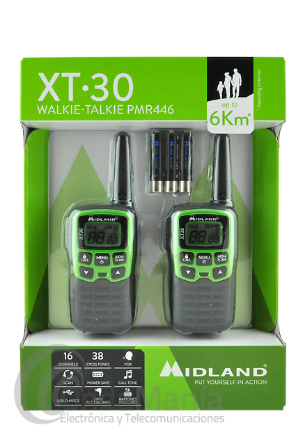 La pareja de PMR-446 de uso libre Midland XT-30 incluyen grandes funciones y accesorios como baterías, tonos CTCSS, botón de llamada, función escáner, función VOX,...