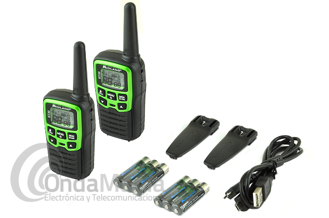 El pack incluye: 2 Alan XT-30, 2 juegos de baterías recargables, 2 clips de cinturón, 1 cable de carga doble para carga mediante toma USB, manual de instrucciones.