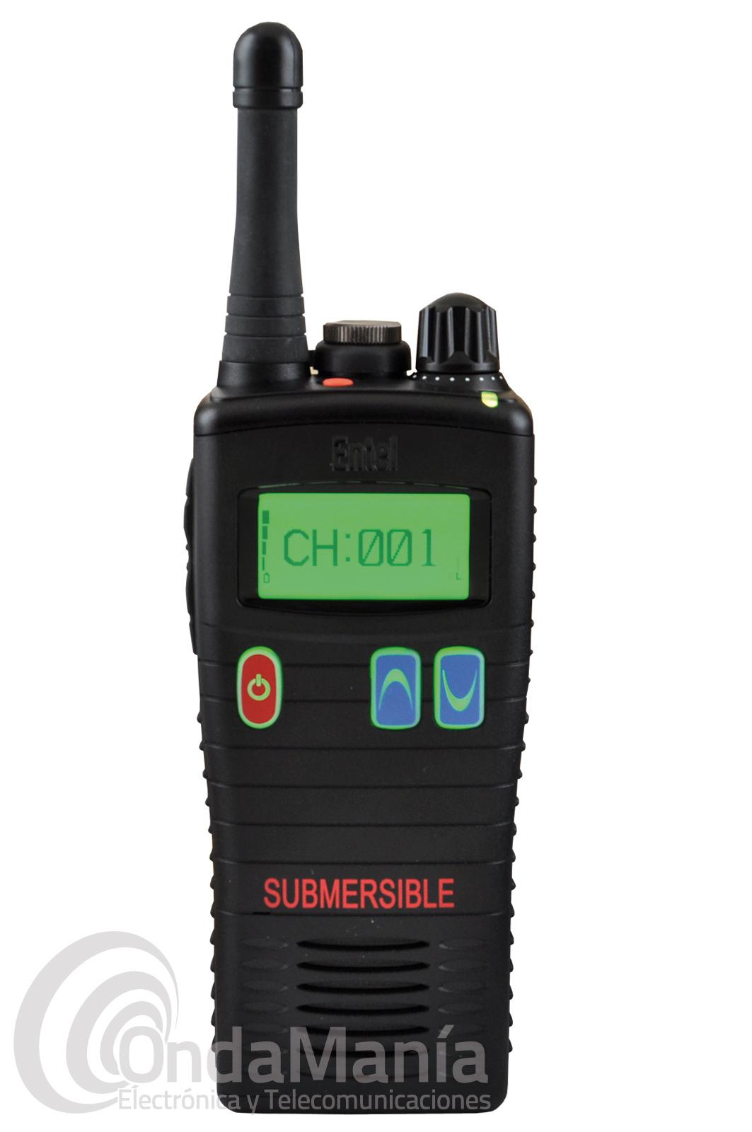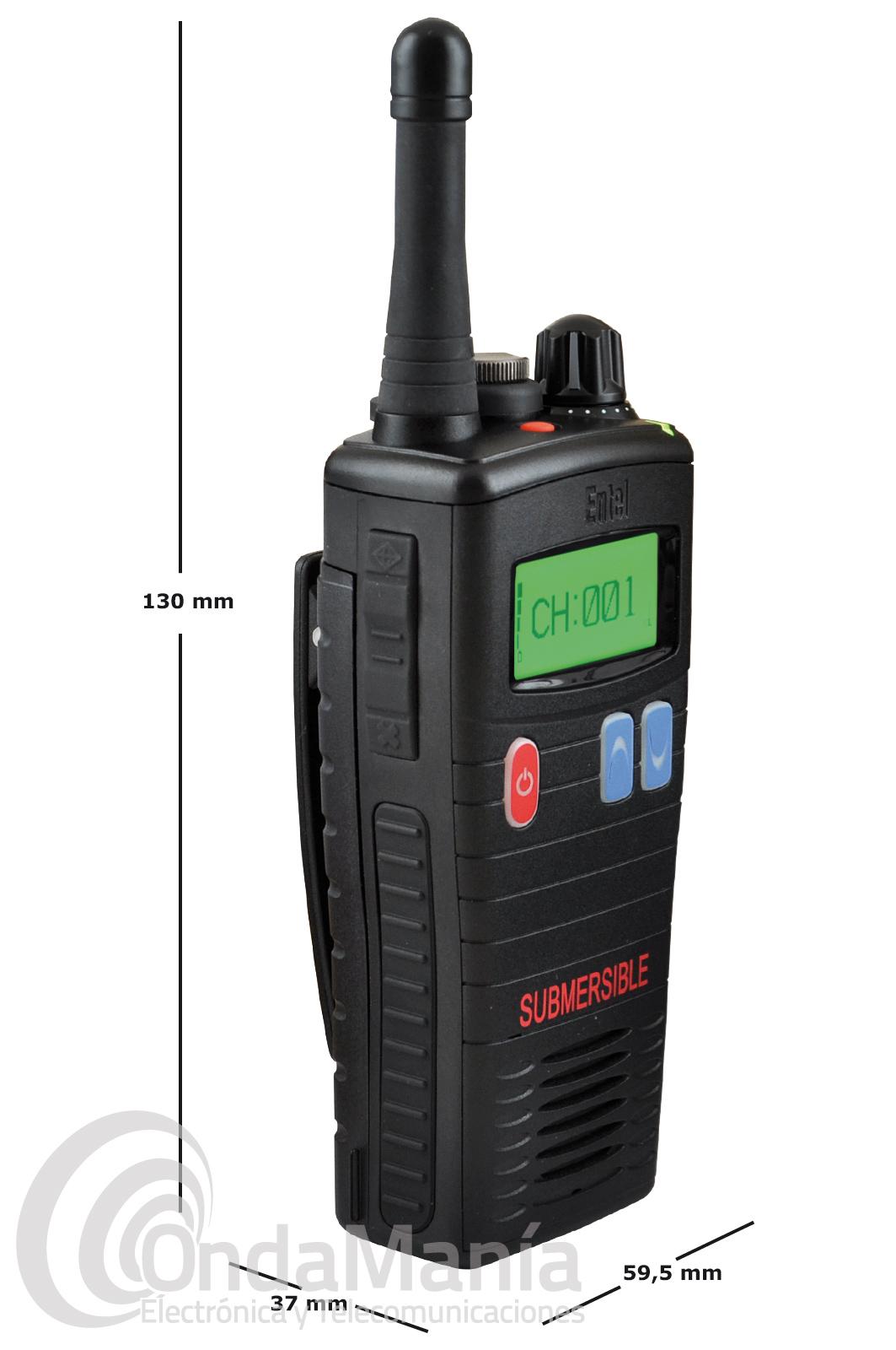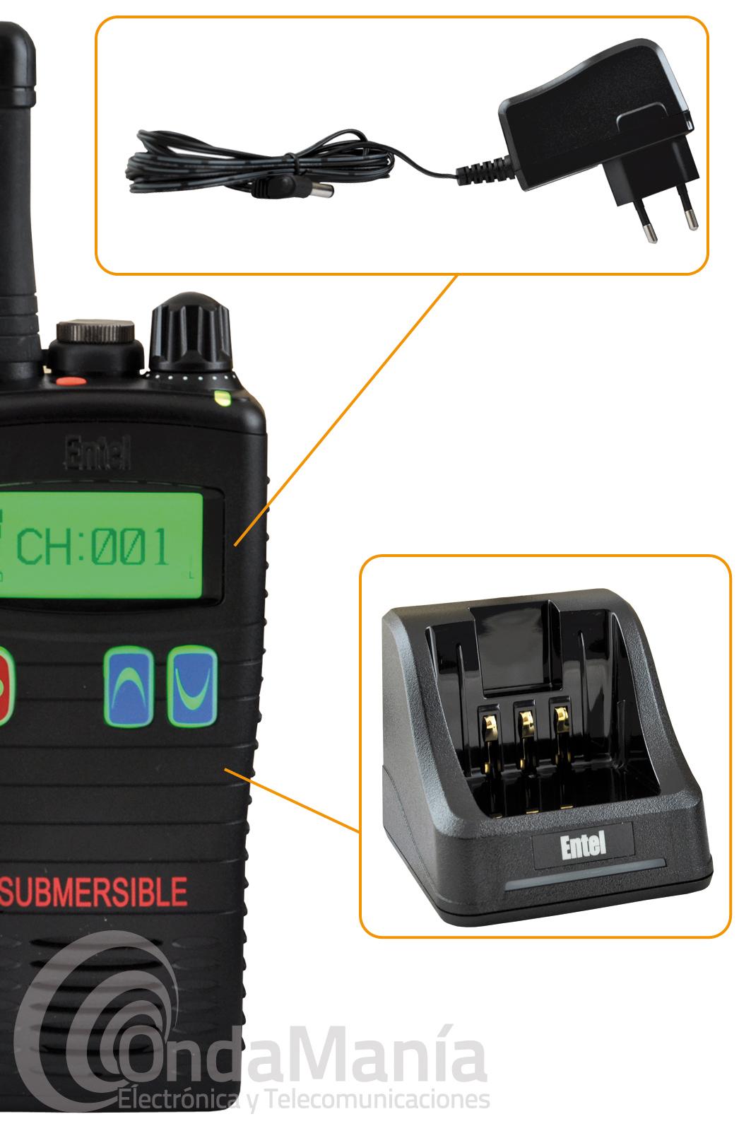 Walky talky de uso libre PMR-446 sumergible Entel HT-446L con display y un grado de protección IP68 y Mil-Std 810C/D/E/F, incluye batería de alta capacidad con 2000 mAh y cargador rápido de sobremesa.