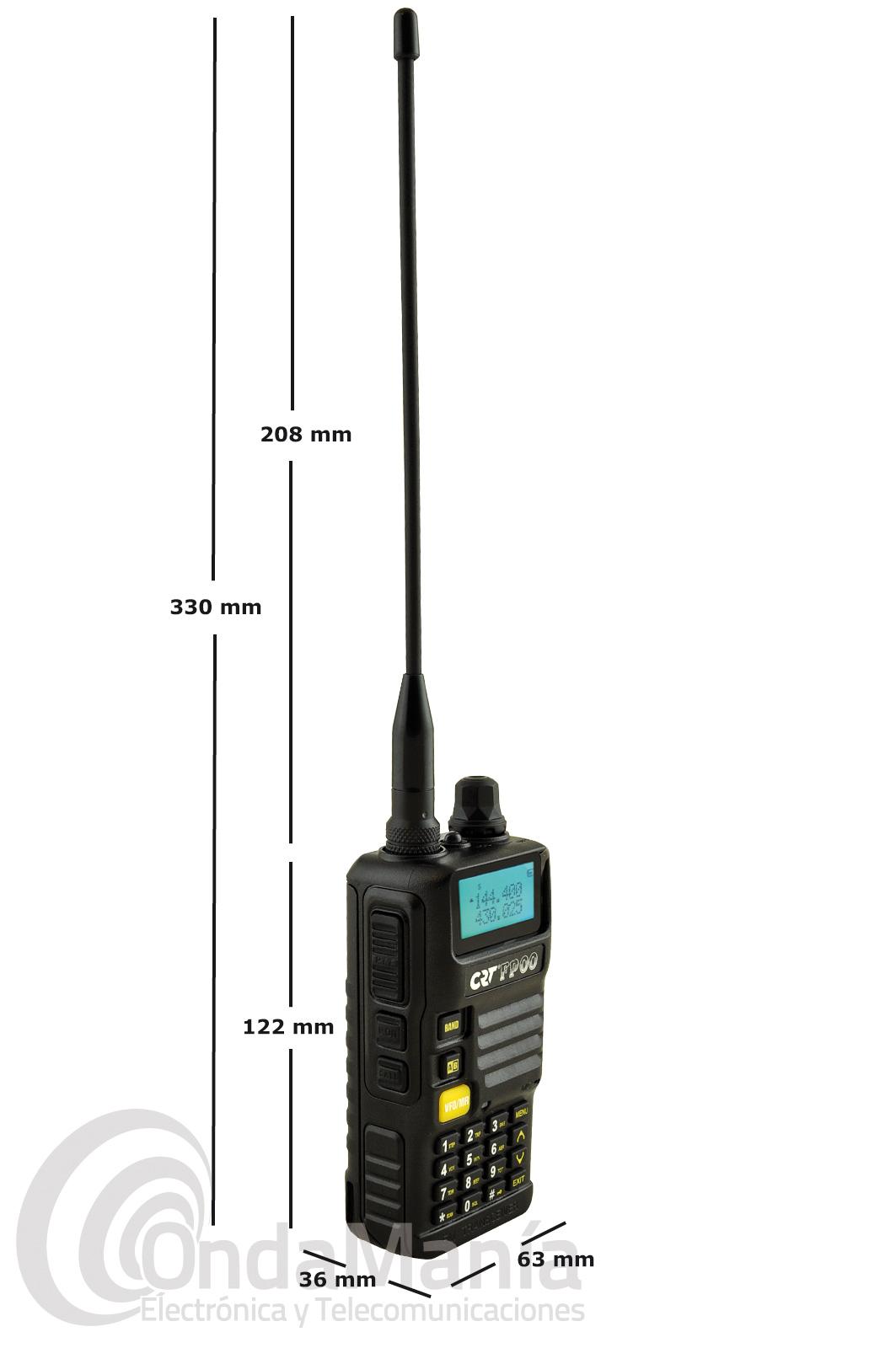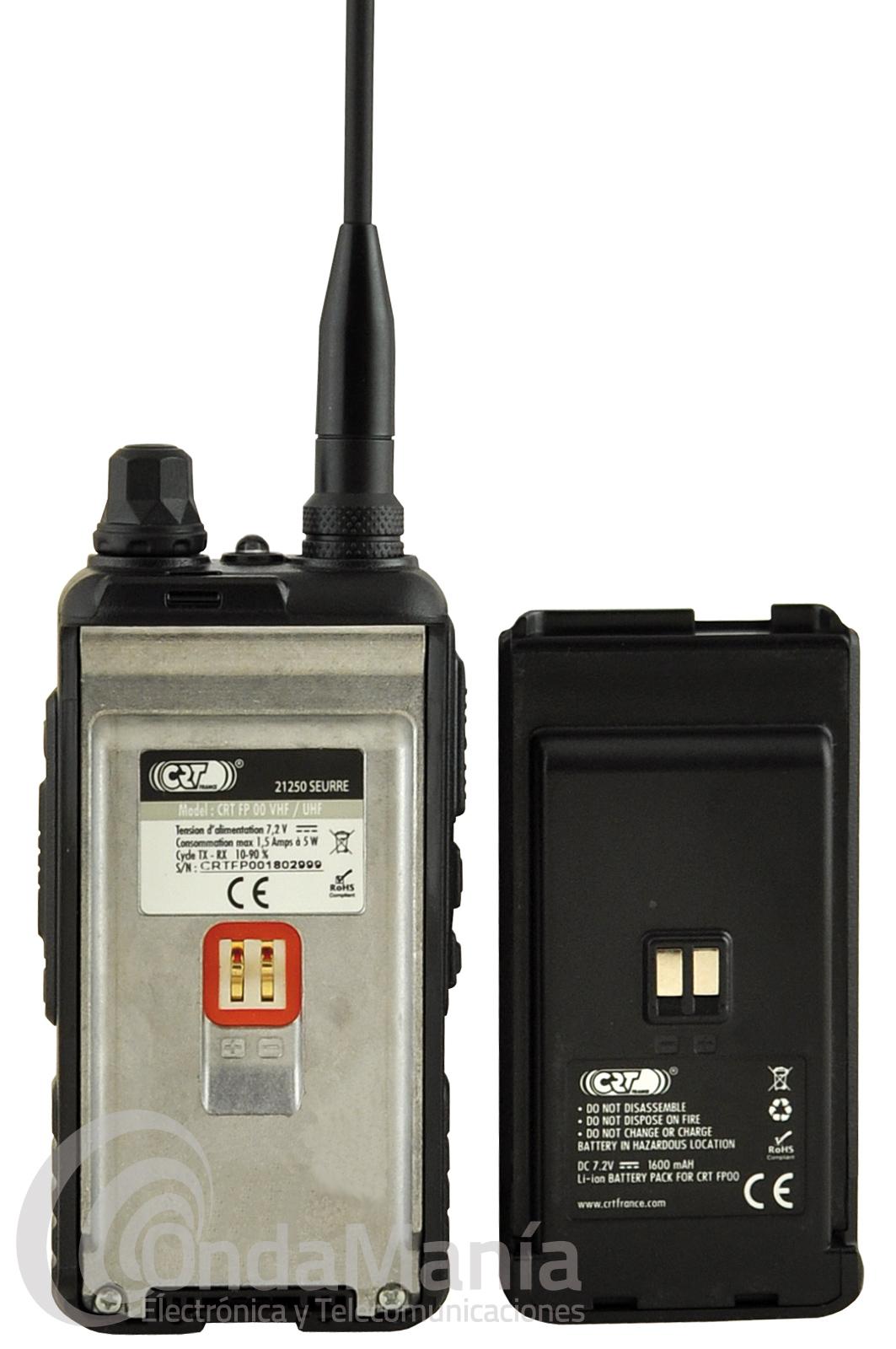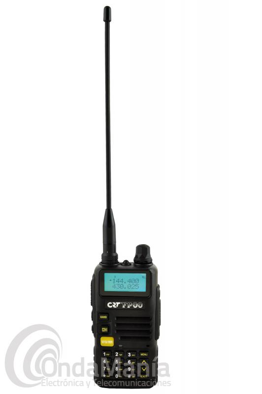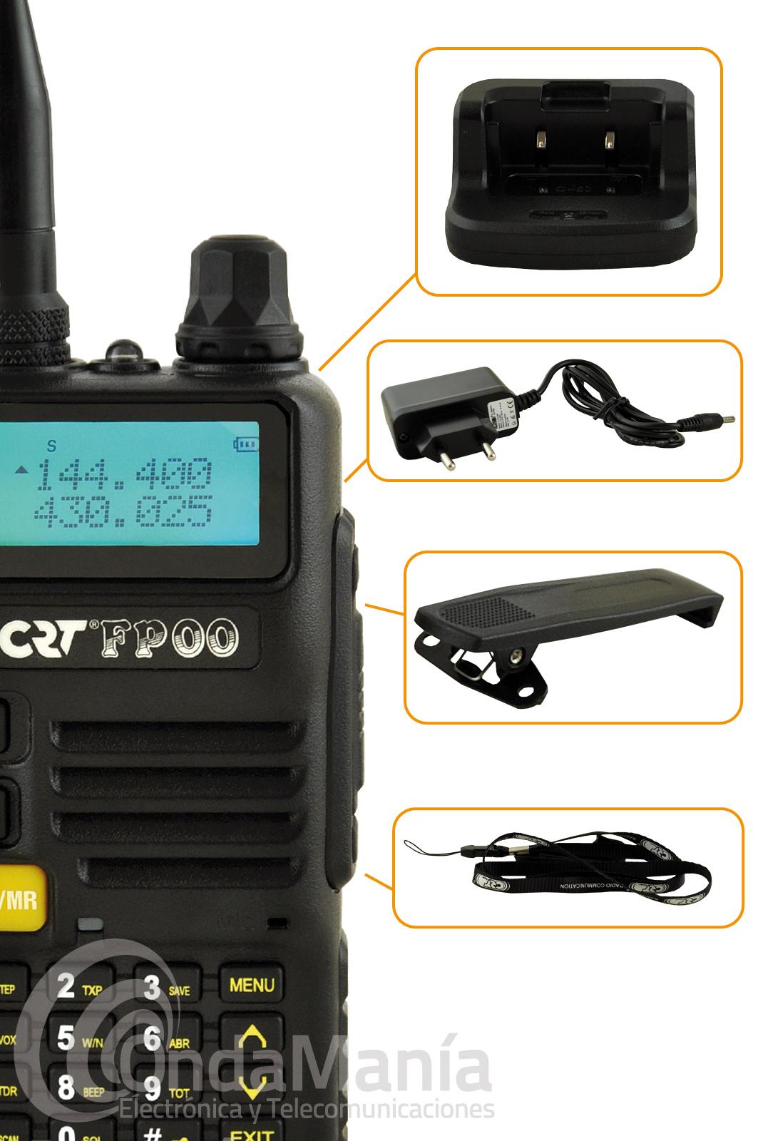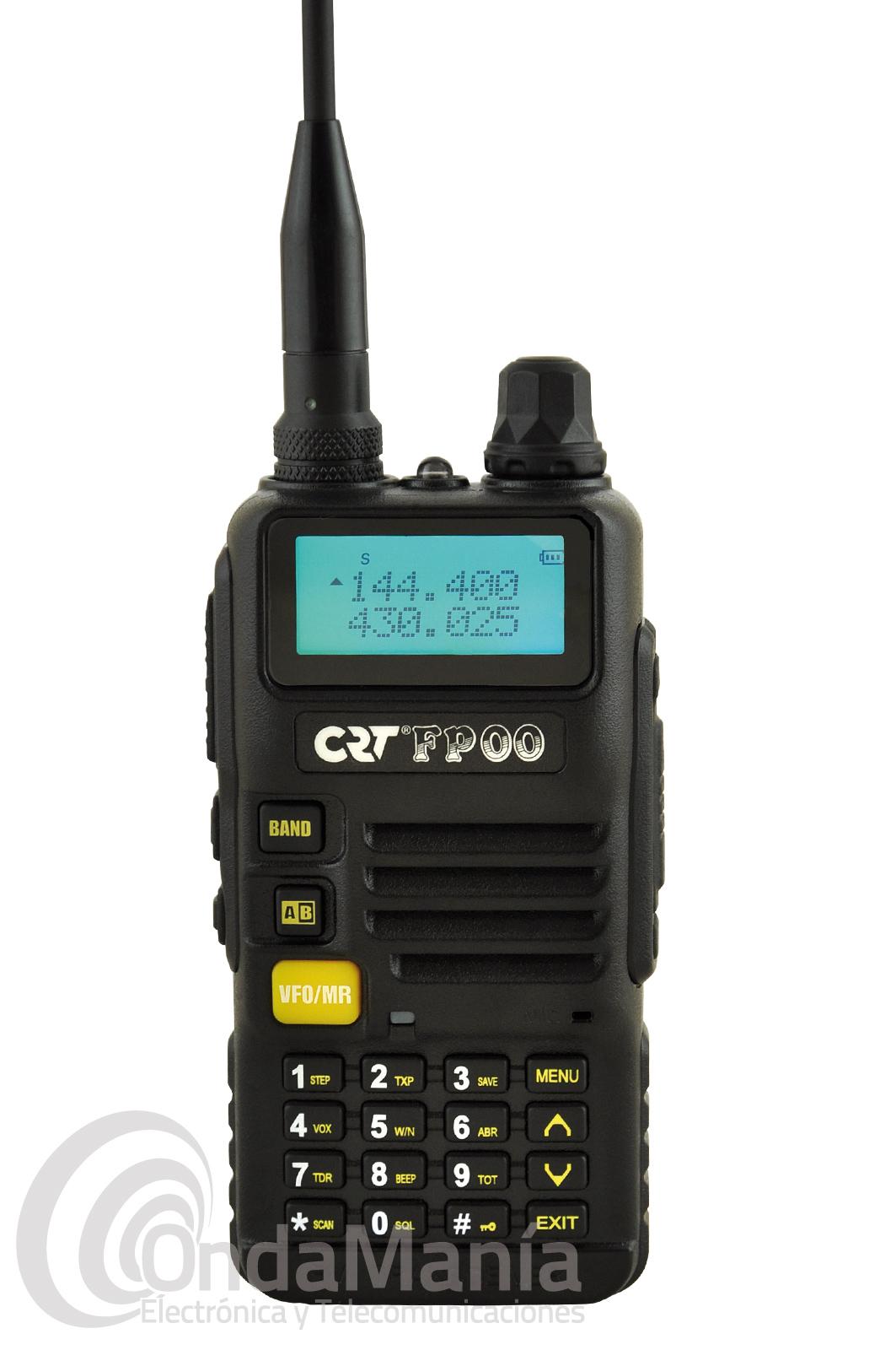El CRT FP00 es un walki doble banda UHF y VHF de reducido tamaño con 5 W de potencia en VHF y 4 W en UHF, dispone de 128 canales de memoria, radio comercial de FM, linterna led, escaner, tonos CTCSS y DCS, incluye cargador rápido inteligente y batería de ion-litio con 7,2 V y 1600 mAh.