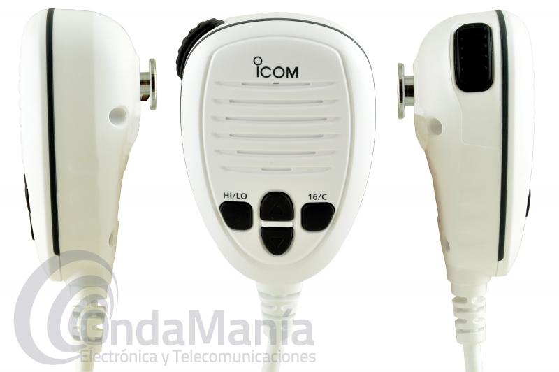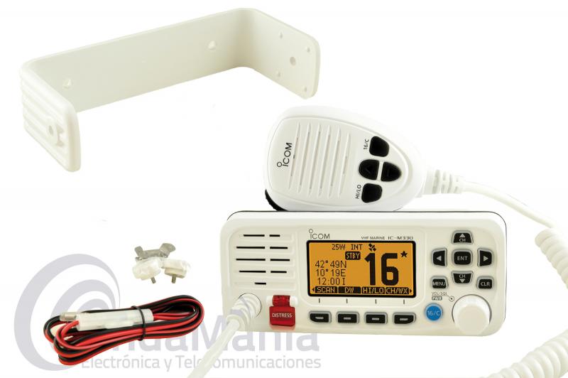 Accesorios suministrados: 1 Icom IC-M330E (sin receptor GPS), soporte de montaje, tornillos, arandelas y pernos de la perilla, soporte de micrófono, micrófono integrado en la emisora, cable de alimentación y manual de instrucciones en Español, Alemán, Frances, Italiano e Inglés.