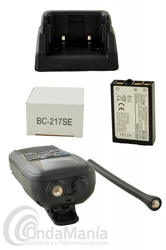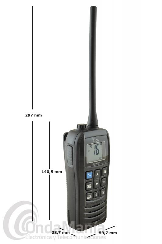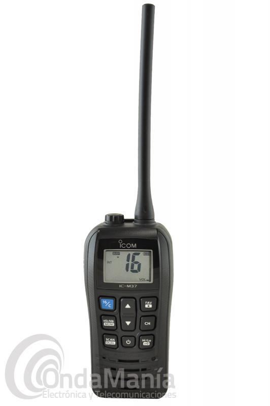 Accesorios incluidos: Icom IC-M37, antena, correa de mano, clip de cinturón, batería, adaptador de carga de 220 V, bañera de carga de sobre-mesa, manual de instrucciones en castellano.