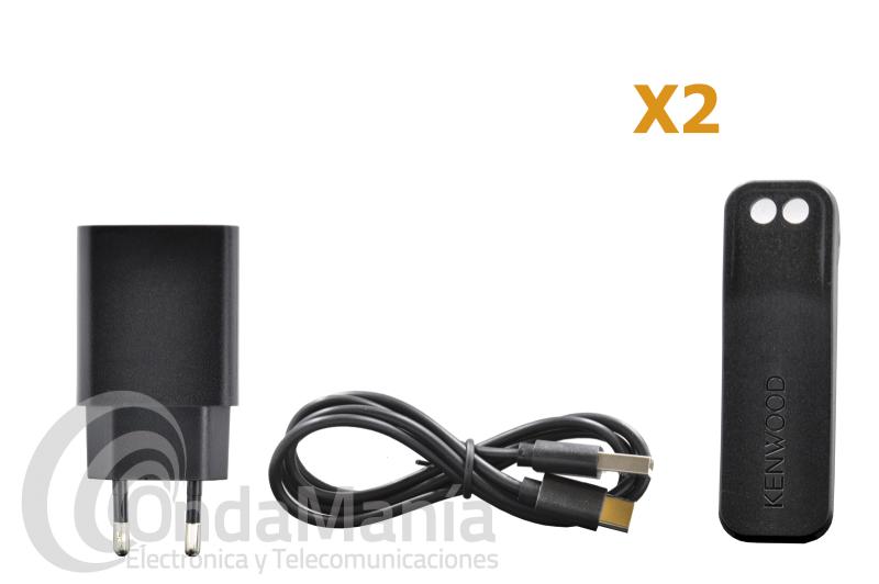 El pack incluye: 2 Walkie Talkies UBZ-LJ9 SET, 2 Baterías Kenwood KNB-86L, 2 Clip de cinturón, 2 Cables de carga USB, 2 Alimentadores de carga 220V a USB, Manual de Instrucciones multi-idioma