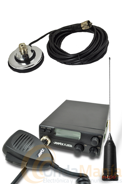 Pack compuesto por un transceptor de 27 Mhz. con 40 canales con AM multinorma, una base magnética PL y una antena.
