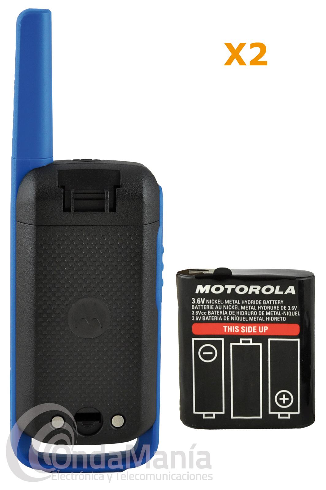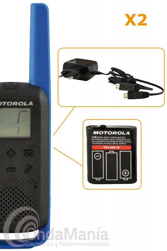 El pack incluye: 2 Motorola T-62 rojos, 2 baterías recargables de Ni.Nh, 2 clip de cinturón, 1 cargador doble 220 V y manual en castellano