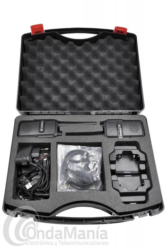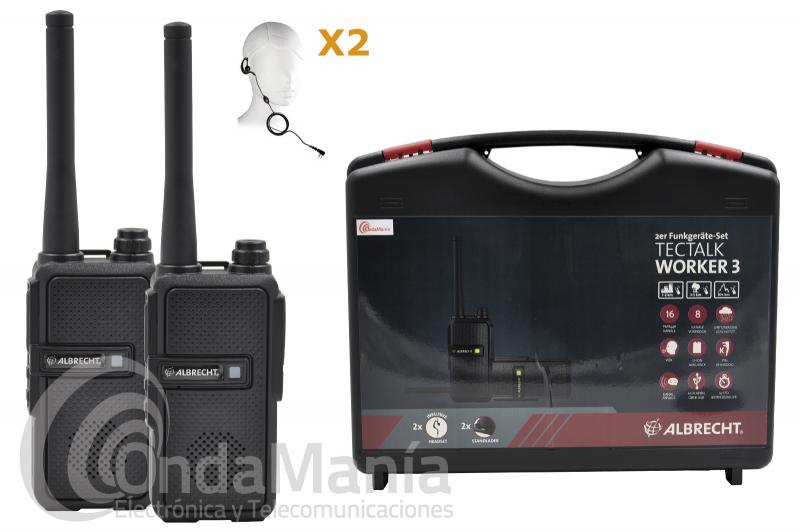 Maleta de 2 walkie talkies PMR-446 de uso libre Albrecht Tectalk Worker 3 tienen entre otras interesantes funciones manos libres, certificación a prueba de salpicaduras y un chasis extremadamente robusto y ergonómico, con un PTT accesible incluso con guantes o manos húmedas. Características que lo hacen perfecto para trabajos duros en exteriores, por ejemplo, en obras de construcción. Incluyen maleta de transporte, pinganillos, batería de litio y cargador.