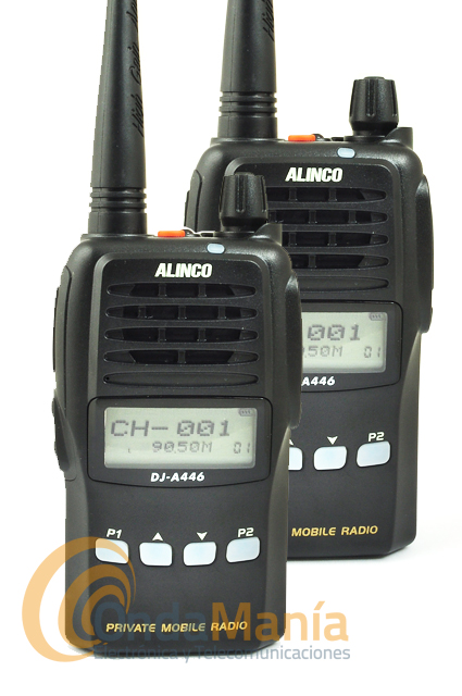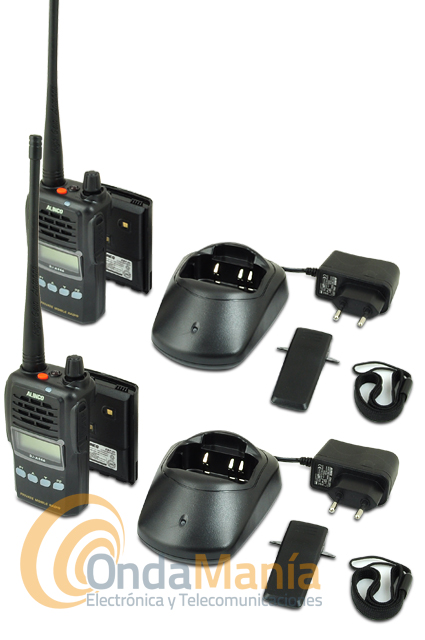 El pack incluye: 2 Alinco DJ-A446, 2 baterías de litio con 1500 mAh, 2 cargadores de sobremesa con alimentador AC/DC, clip de cinturón, correa de mano y manual de instrucciones en castellano.