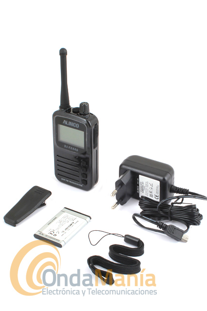 Artículos suministrados: 1 PMR446 Alinco DJ-FX446, batería de Ion-Litio, alimentador cargador 220V, clip de cinturón, correa de mano y manual de instrucciones en castellano.