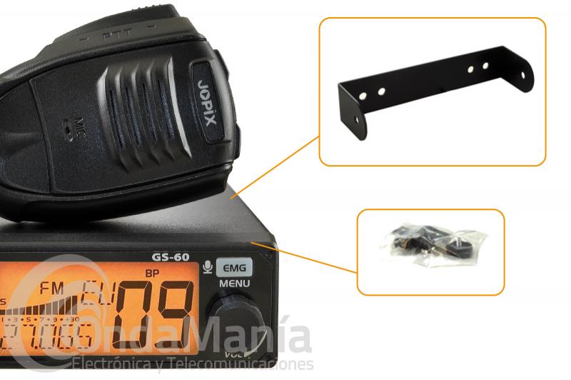 El pack incluye: 1 Jopix GS-60, 1 micrófono, 1 soporte de micrófono, 1 soporte de emisora, tornillos y manual de instrucciones en castellano.