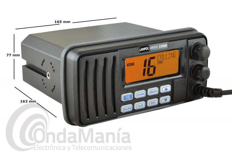 Emisora marina de VHF Jopix Marine 3300 homologada por la DGMM, clase D, con 55 canales, cumple la norma IP67, con una potencia de 25 W, dispone de función de doble o triple escucha y toma para altavoz externo, este modelo no dispone de DSC.