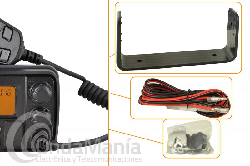 El pack incluye: emisora Jopix Marine 3300, micrófono de mano, soporte para la emisora, soporte de micrófono, tuercas laterales, tornilleria, cable de alimentación y manual en castellano.