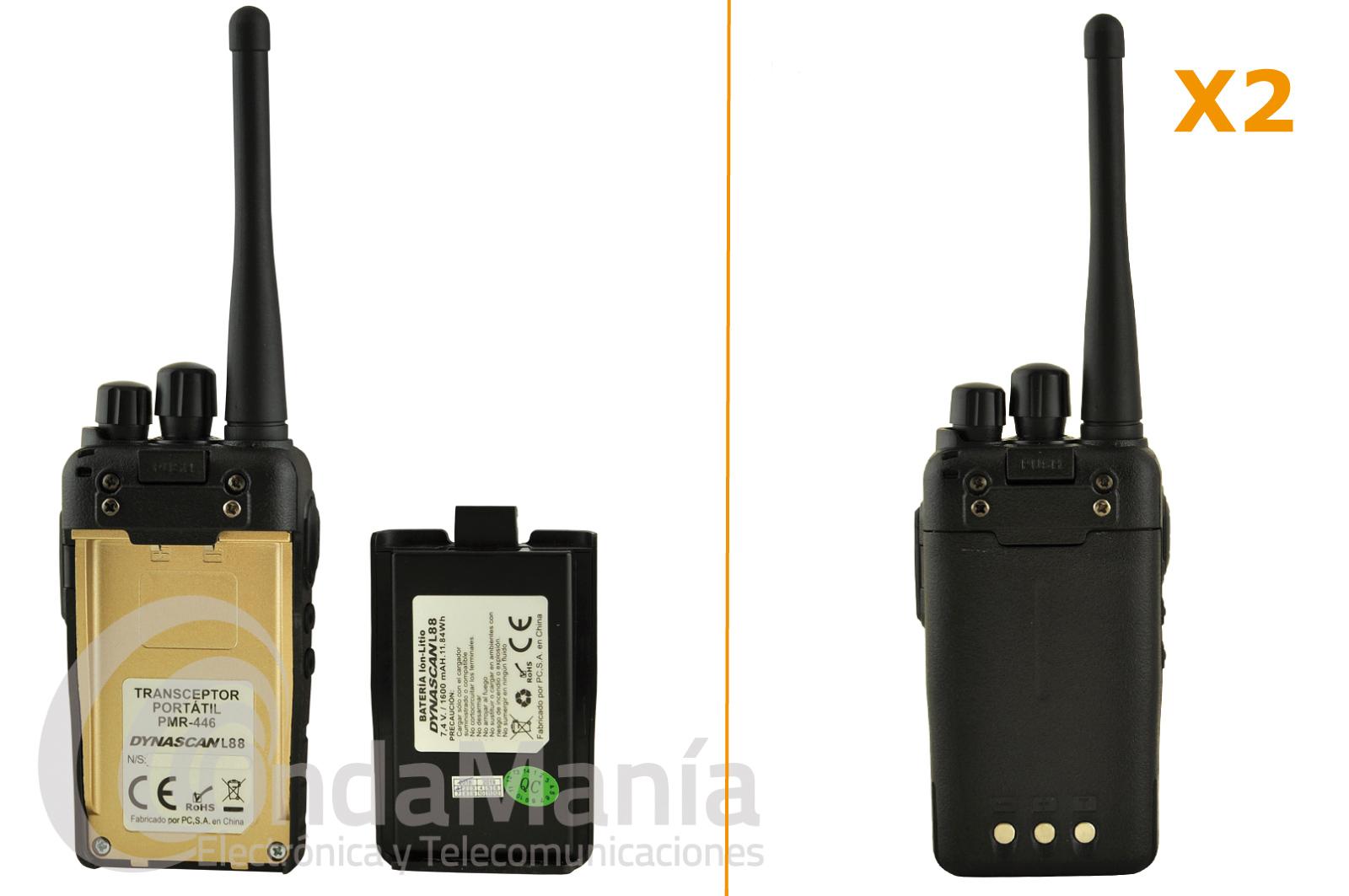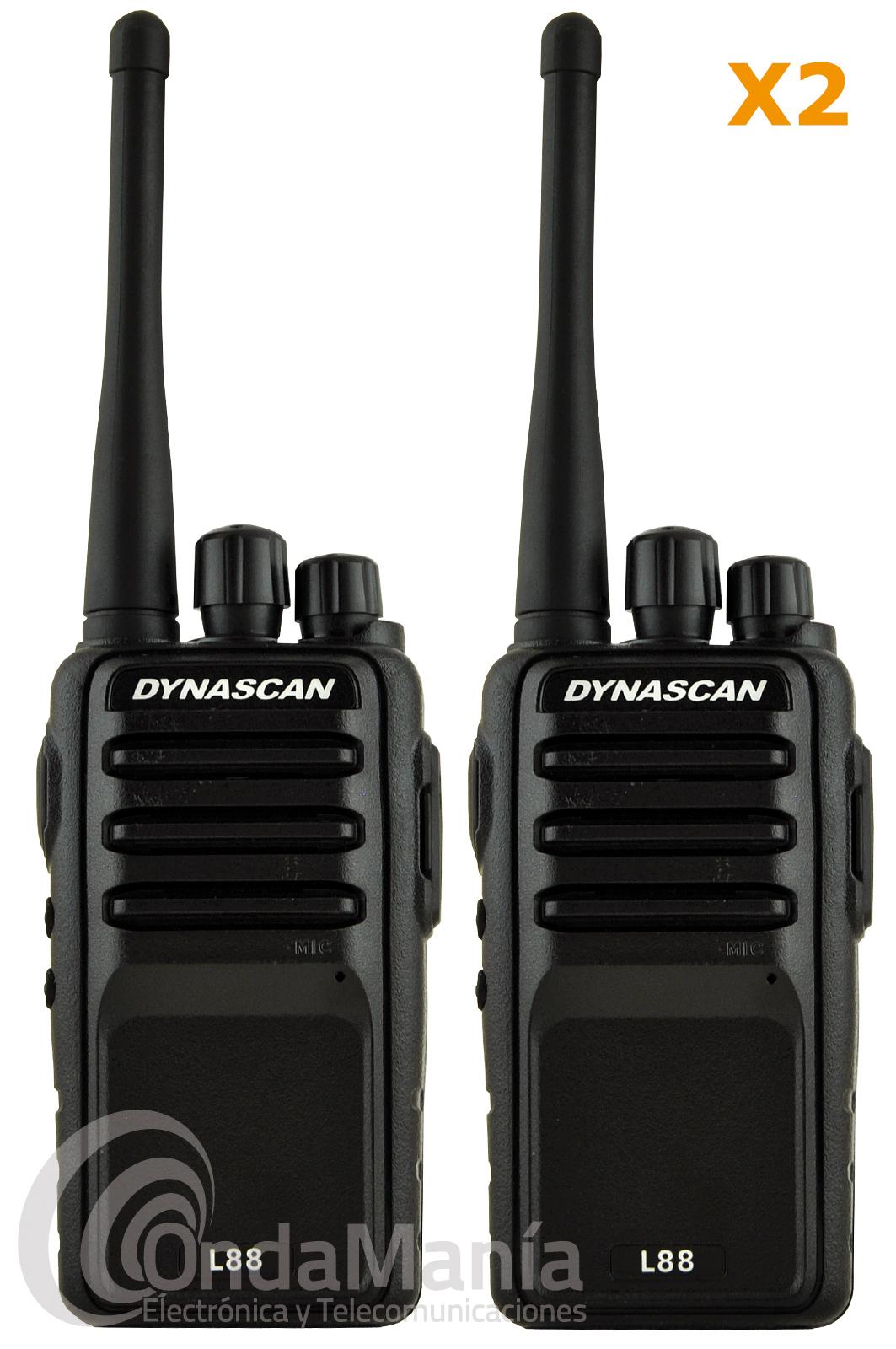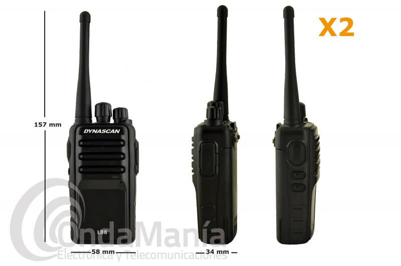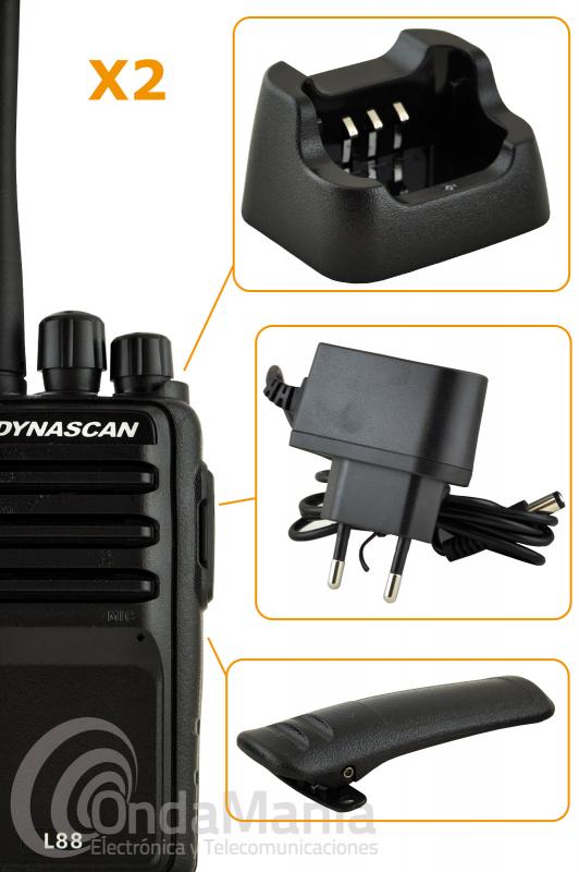 Pack compuesto por 2 Dynascan L-88 con pinganillos, cargadores, baterías,... El Dynascan L-88 es un walky de uso libre PMR-446 profesional de reducido tamaño con una gran calidad de audio, incluye scrambler (secrafonia), batería de litio con 1600 mAh, VOX, cargador rápido de sobremesa,....