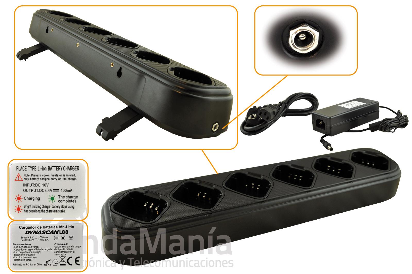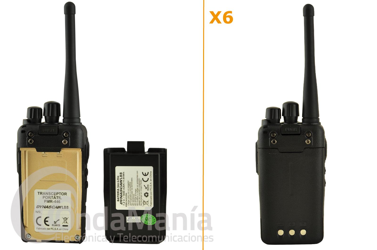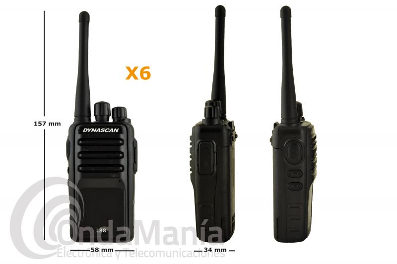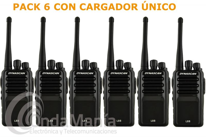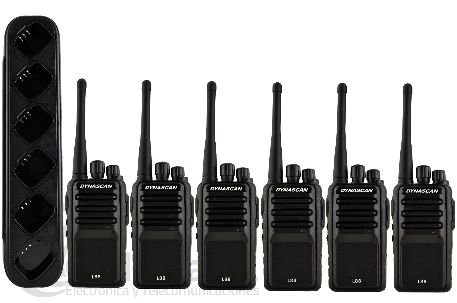 Pack compuesto por 6 Dynascan L-88 PMR-446 de uso libre con un cargador rápido múltiple con 6 bañeras de carga. El Dynascan L-88 es un walky de uso libre PMR-446 profesional de reducido tamaño con una gran calidad de audio, incluye scrambler (secrafonia), batería de litio con 1600 mAh, VOX,....