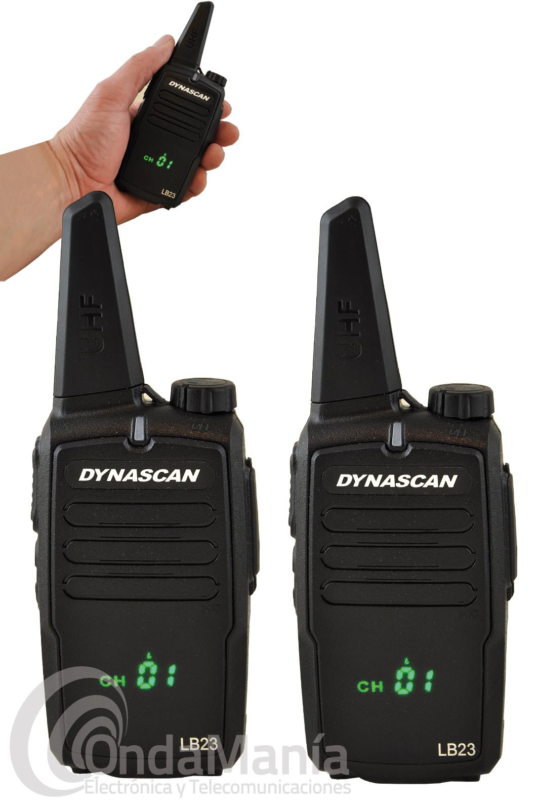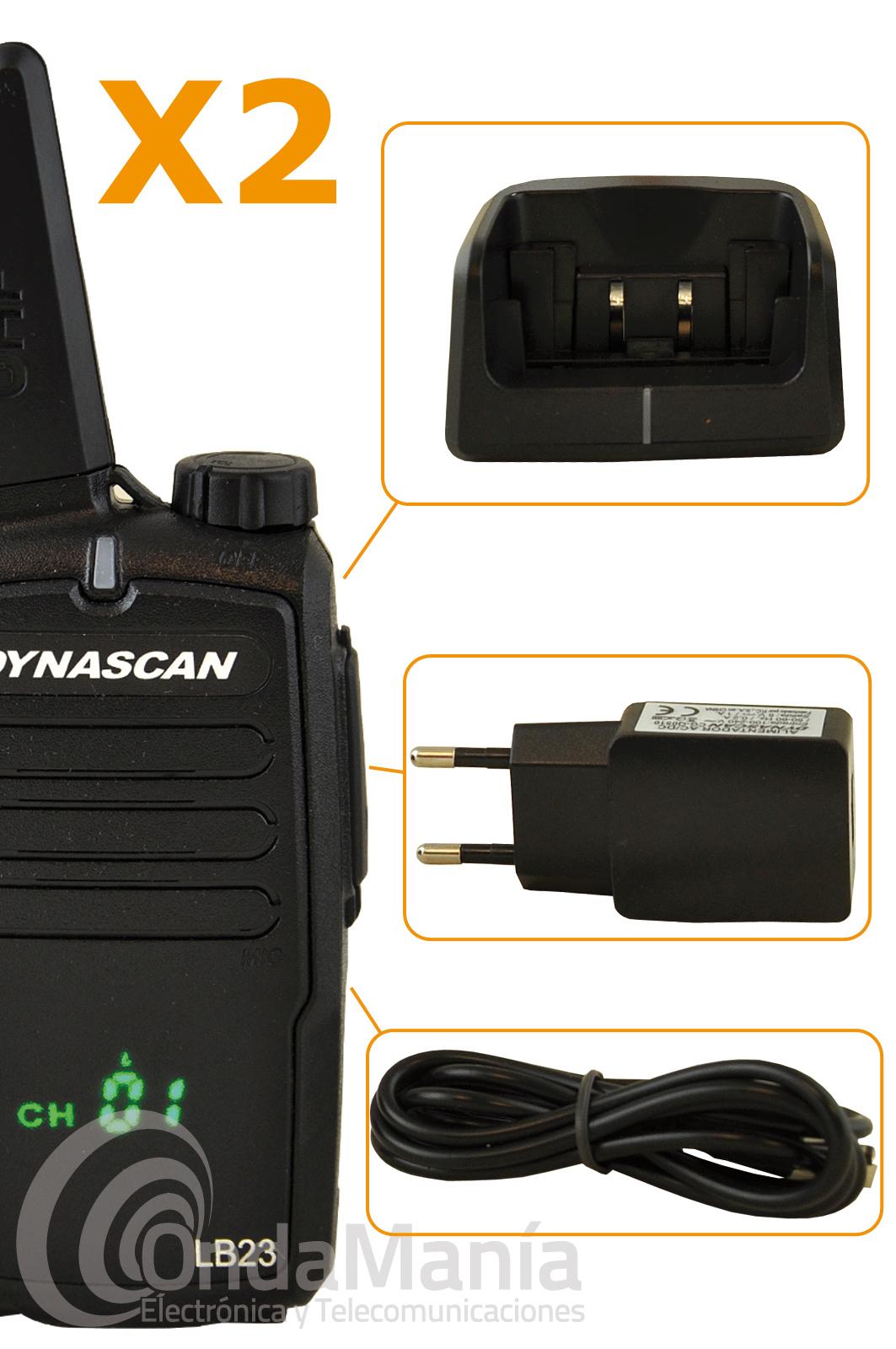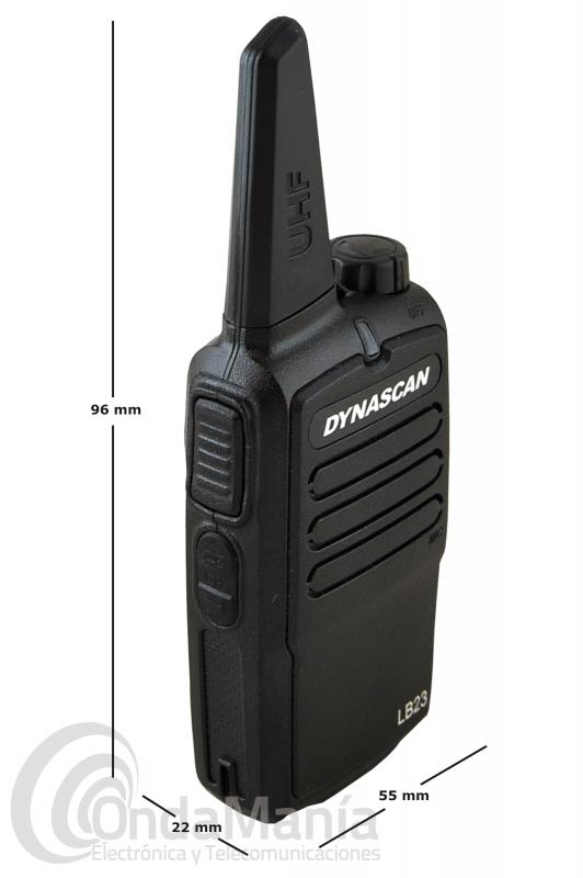 Los walkie talkies Dynacan LB23 son una pareja de PMR-446 de uso libre de reducido tamaño, disponen de un display frontal oculto (tecnología Hidden), disponen de hasta 199 canales programables, su recepción es de gran calidad, indicación por voz, bloqueo acústico, reducido tamaño, batería de Ion-litio con 1000 mAh y cargadores de sobremesa individuales.