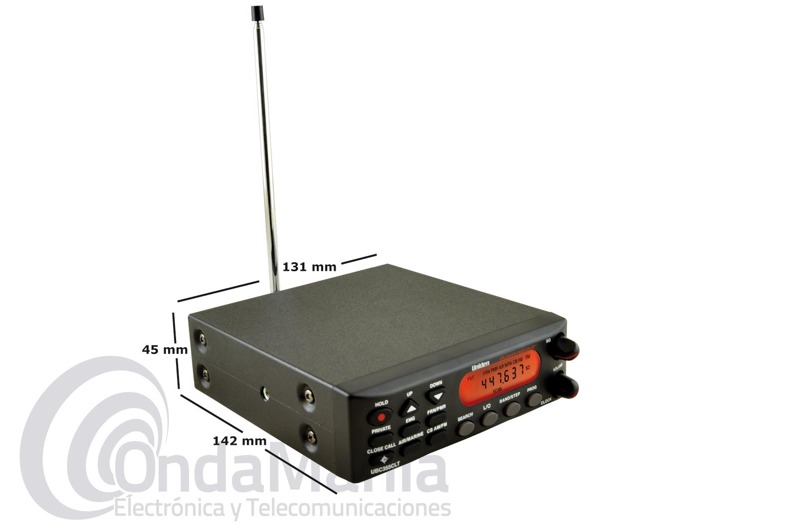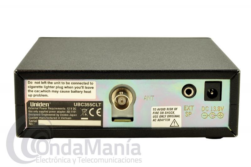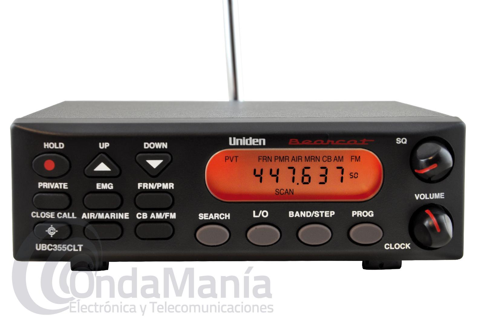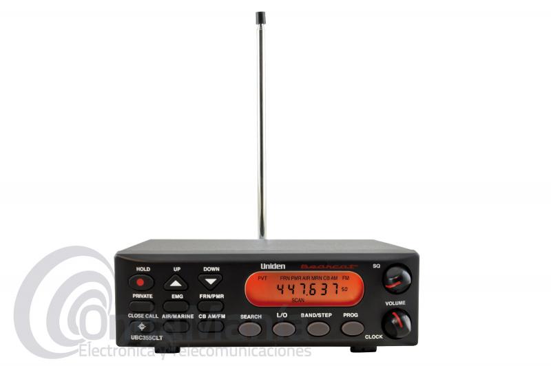 Uniden UBC355CLT receptor-escáner de sobremesa con una cobertura de 25 a 960 Mhz, repartida en 4 bancos de 25 a 87, 108 a 174, 406 a 512 y de 806 a 960 Mhz, 300 canales de memoria, display LCD con indicador de funciones, saltos de frecuencia 5, 6.25, 10, 12.5 y 8.33 en banda aérea.