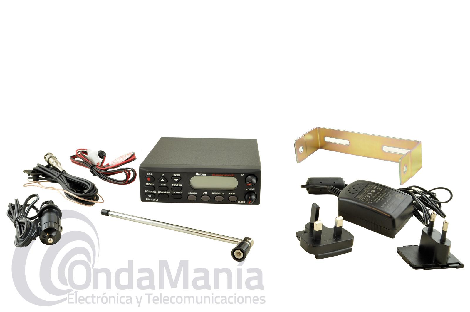 El pack incluye: 1 Escáner Uniden UBC355CLT, 1 antena telescópica, 1 antena móvil fijable, 1 adaptador CA, 1 Adaptador de corriente para el vehículo, 1 cable de alimentación de CC para obtener energía de cableado desde su automóvil a su escáner, 1 soporte, tornillos y manual de usuarío en castellano.