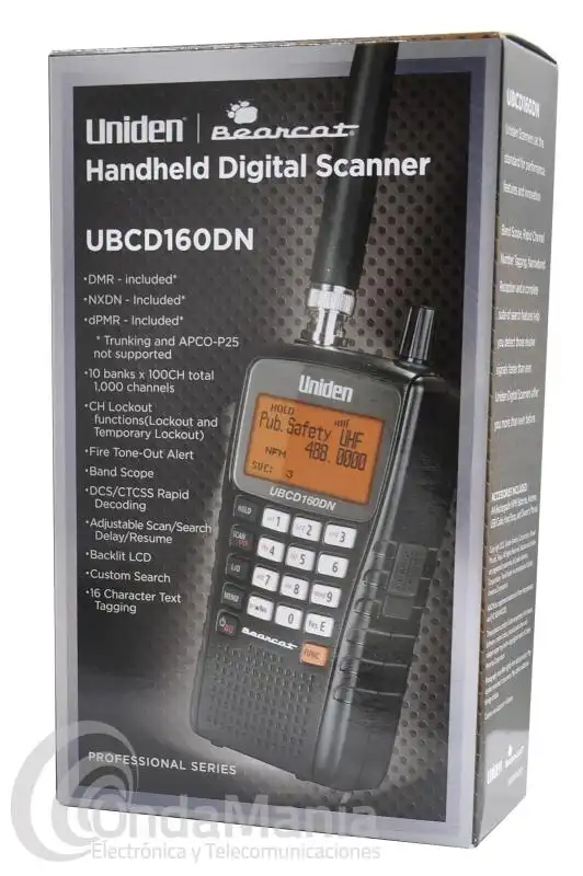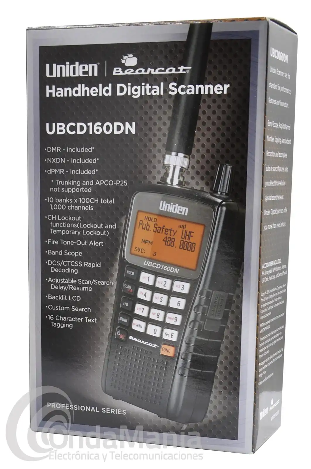 El Uniden UBCD160DN es un escáner portátil compacto que cubre diversas bandas de radio comerciales, radioaficionados, banda aérea, marina,.... Con capacidad para recibir señales digitales dPMR, DMR y NXDN, con un rango de frecuencia de 25 a 520 Mhz, 758 a 824 Mhz, 849 a 869 Mhz, 894 a 960 Mhz, con 1000 memorias alfanuméricas,....