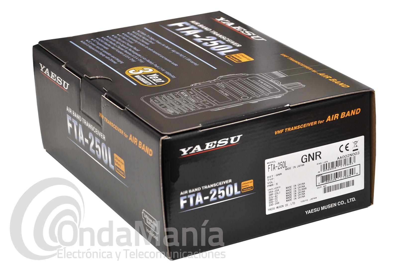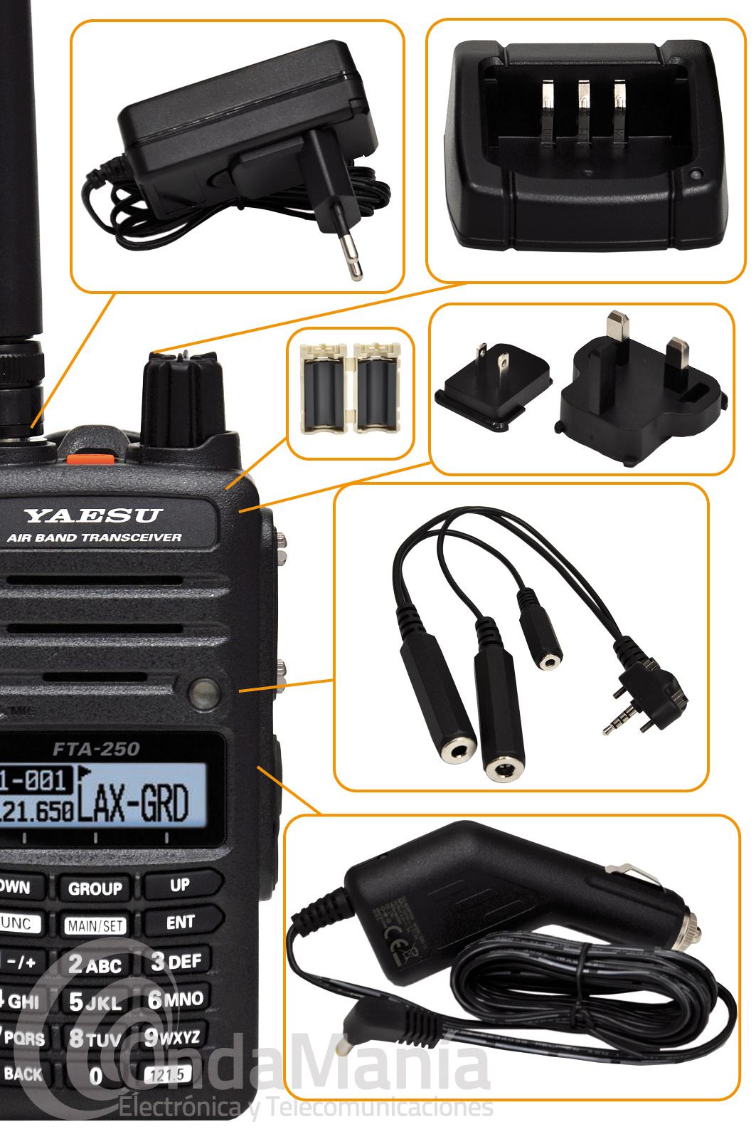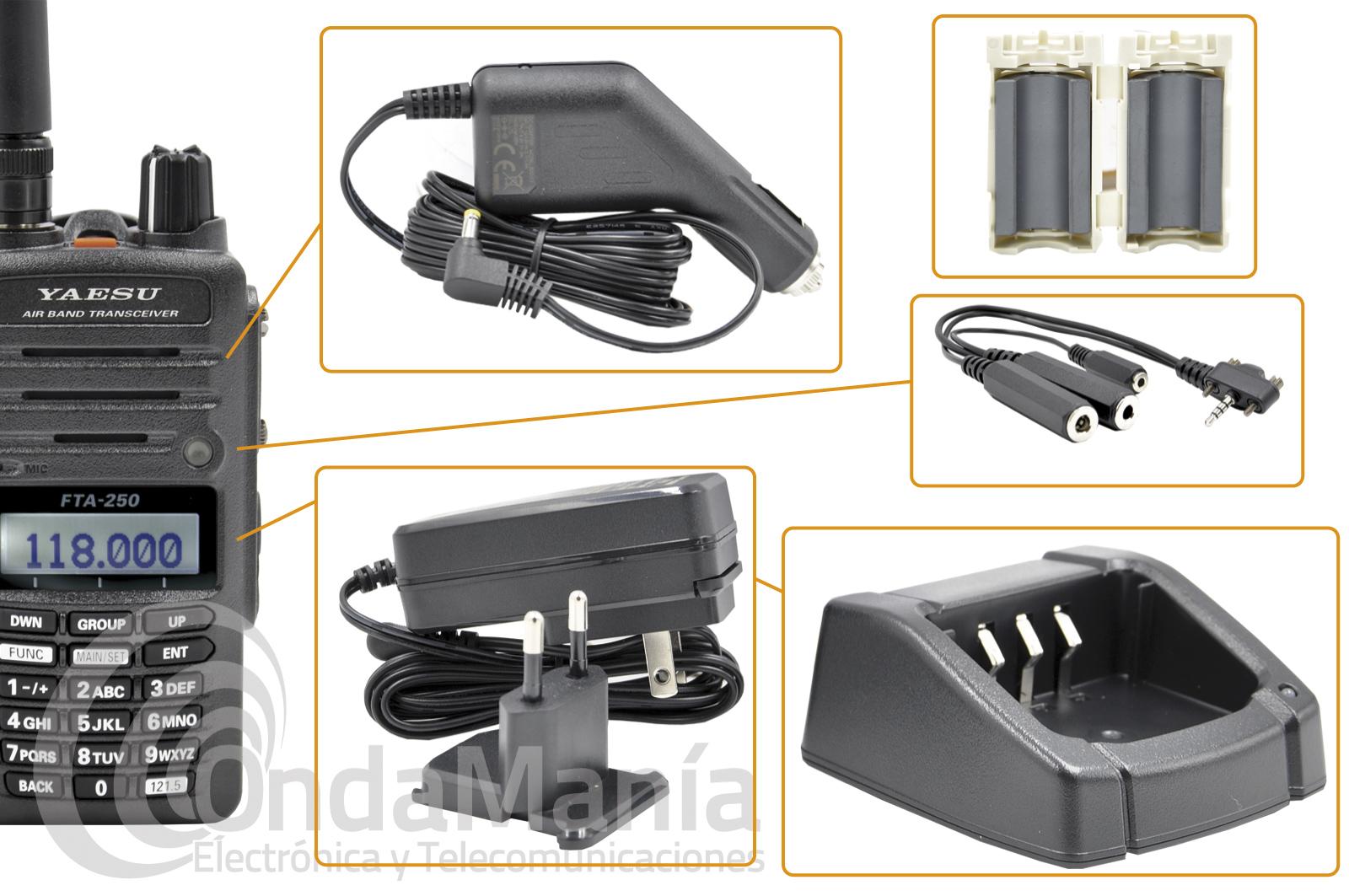 El pack incluye: Yaesu FTA-250L, batería de Ion-Litio SBR-25Li, Adaptador CA SAD-26, bañera de carga SBH-22, adaptador de encendedor CC/CA, Antena SRA-20A, cable adaptador para cascos con auriculares SCU-42, clip de cinturón SBH-18, nucleo de ferrita y manual de instrucciones.