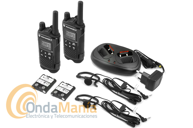 Accesorios incluidos: 2 Motorola xt-180, 2 baterías de Ni-Mh, 2 clips de cinturón, 2 correas, 1 bañera doble de carga, 1 alimentador 220 V, manual de instrucciones y 2 pinganillos.