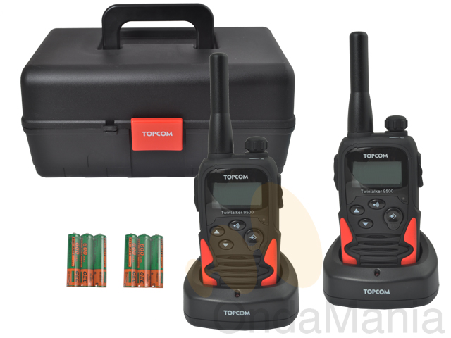 La pareja de PMR Twintalker 9500 Long Range incluyen baterías y cargadores individuales, caja de transporte, vibración, 15 tonos de llamada y múltiples funciones.