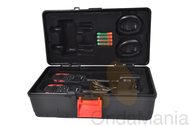 El pack incluye: 2 portátiles PMR, 2 cargadores de sobremesa con adaptadores incluidos, 6 baterías recargables tipo AAA, 2 clip de cinturón, caja de transporte tipo a las cajas de herramientas.