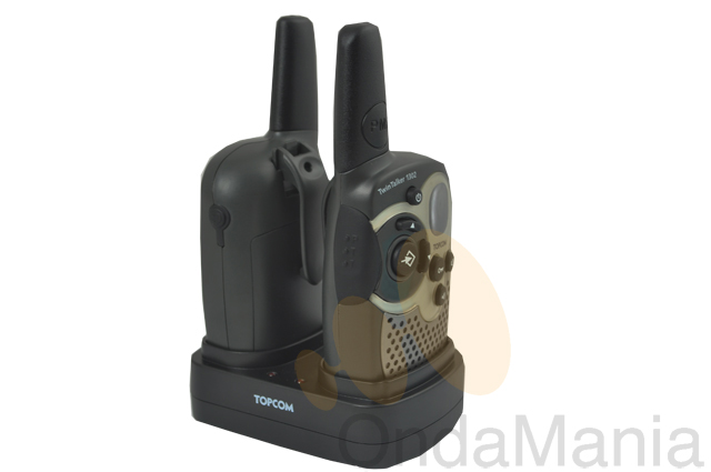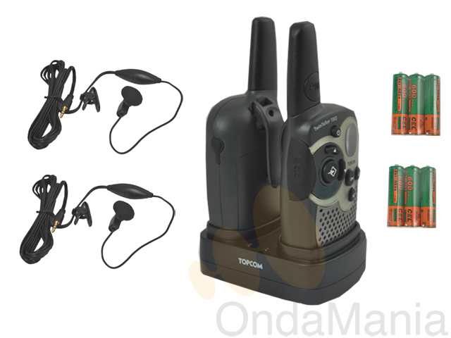 El pack incluye: 2 portátiles PMR, 2 micro-auriculares, cargador doble con alimentador de 220V, 2 juegos de tres baterías recargables tipo AAA y dos clip de cinturón.