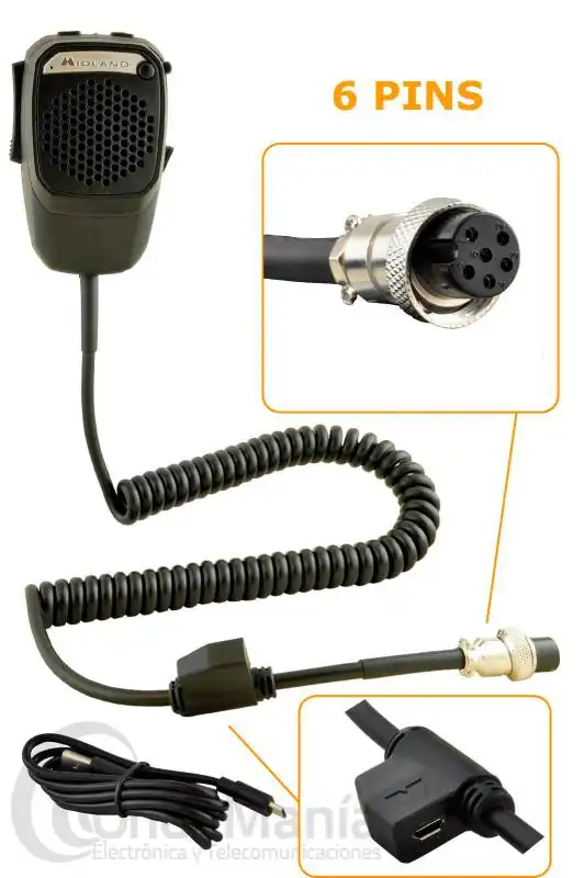 Micrófono con conector de 6 pins, compatible con Midland y President, incluye PTT.
