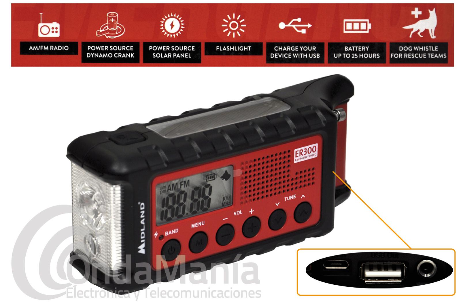 Midland ER300 es un dispositivo de emergencia equipado con un receptor AM / FM, diseñado principalmente para situaciones de emergencia, calamidad y seguridad donde mantenerse en contacto es esencial. Pero no solo eso, también es una excelente solución para el uso diario, para todas las actividades al aire libre, camping o en el tiempo libre, y es fácil de llevar contigo gracias a su práctica asa. El Midland ER300 tiene la particularidad de poder cargarse de 3 formas diferentes: mediante dínamo ubicada en la parte posterior del producto, que permite la recarga manual en ausencia de dispositivos de recarga, con un panel solar que recarga la batería interna Li-Ion 2200mAh, o simplemente con pilas recargables.