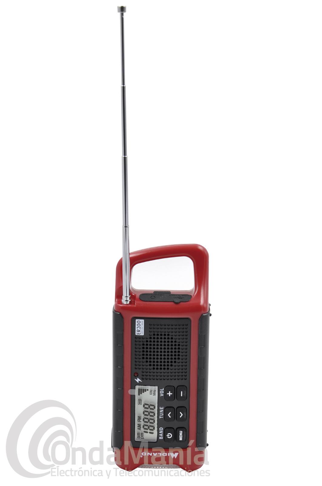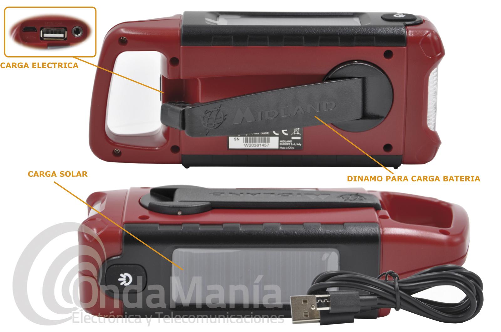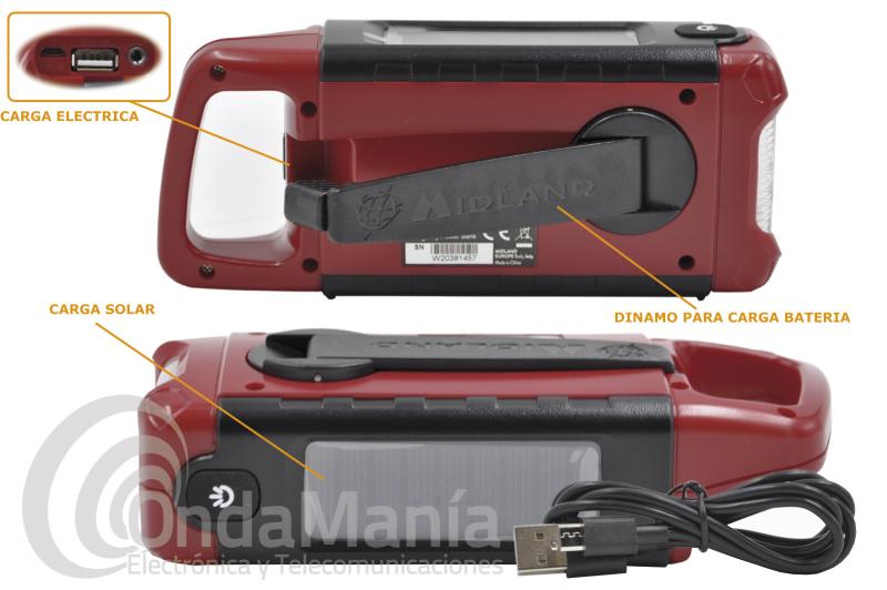 El Midland ER200 dispone de múltiples fuentes de recarga sostenibles: dínamo, panel solar y baterías recargables.