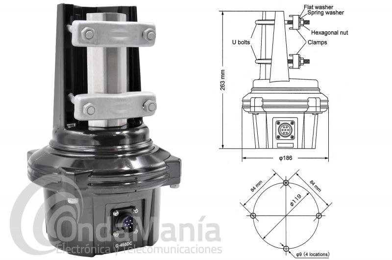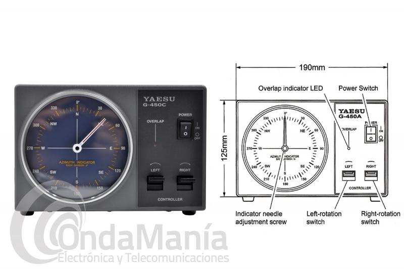 Rotor de antena Yaesu G450CDC. Esta línea de rotores de antena para radioaficionados e instaladores es el resultado de la considerable experiencia de YAESU en diseño y construcción hasta el momento. Con sus 8 modelos diferentes de rotores y mandos a distancia permite satisfacer las más variadas necesidades de soporte para antenas. De hecho, la amplia gama de modelos le permite elegir el rotor adecuado para antenas de televisión, antenas VHF/UHF, antenas para comunicaciones por satélite hasta grandes antenas direccionales para bandas de HF tanto tribanda como mono-banda. El grupo motor está alojado en una caja de aluminio fundido a presión resistente al agua y protegida con tratamientos especiales a la intemperie. Las partes mecánicas están lubricadas en fábrica y no requieren mantenimiento incluso en condiciones climáticas adversas. Están equipados con un freno automático o manual. El control remoto está equipado con medidores analógicos rectangulares o circulares para indicar la dirección del azimut. De particular interés para los radioaficionados entusiastas de las conexiones satelitales son los modelos que ofrecen rotación de azimut y elevación de 0 a 180 °.