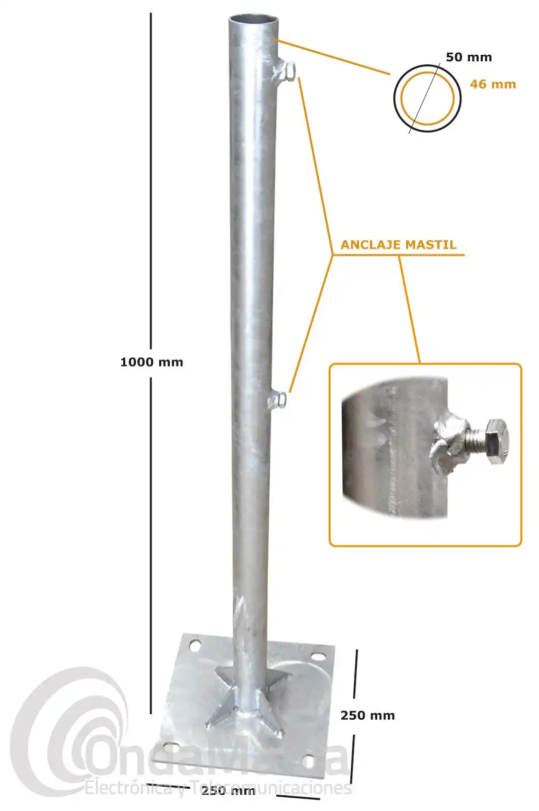 PIE DE MASTIL GALVANIZADO CON 1 METRO Y 50 MM DE DIAMETRO