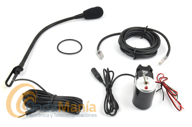 Micrófono manos libres para equipos móviles Kenwood con conector tipo "RJ" (telefónico) ideal para el Anytone AT-5888 y el CRT-270,... incluye flexo y es muy rápido y fácil instalarlo, incluye una goma para sujetarlo a la palanca de cambios, también se puede sujetar con belcro, conmuta la TX/RX mediante un conmutador tipo palanca, el micrófono es unidireccional tipo condensador e incluye un potenciometro para ajustar la ganancia. Requiere alimentación 12 VCC.