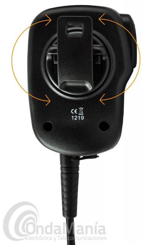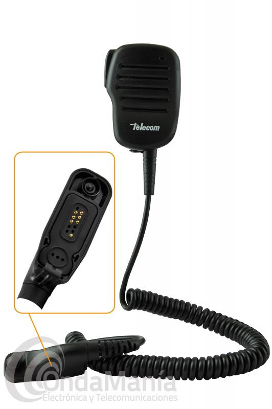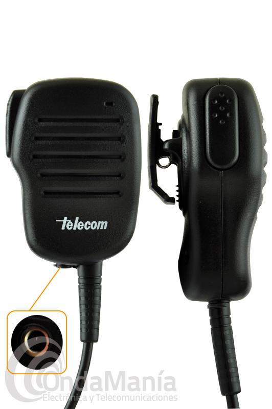 Micrófono altavoz Telecom JD-500DMR compatible con los Motorola DMR Mototorbo como los DP-3400, DP-3401, DP-3600, DP-3601,... Incluye toma de 3,5 mm para auricular. Resistente al agua IP-54. Clip giratorio.