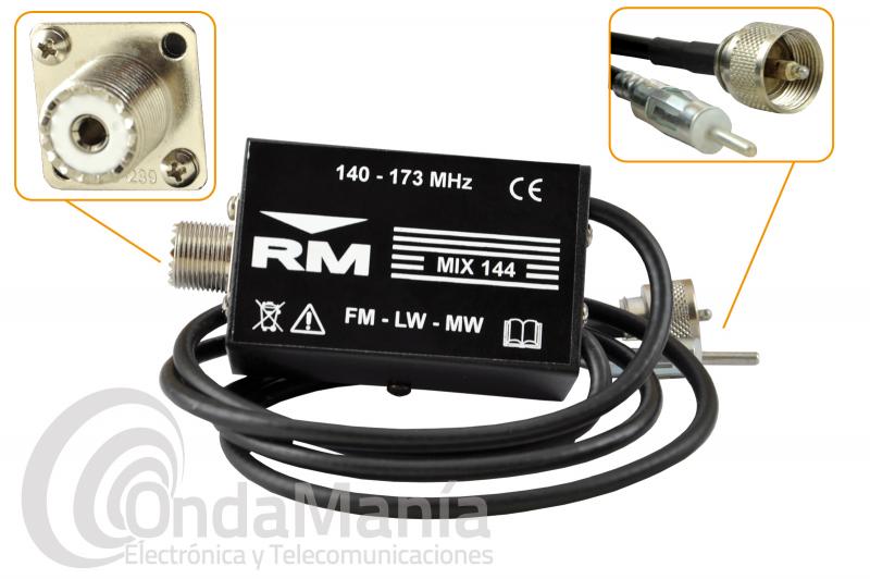 El duplexor RM MIX-144 permite conectar una sola antena de VHF al auto-radio del vehículo y a la emisora o walki de VHF