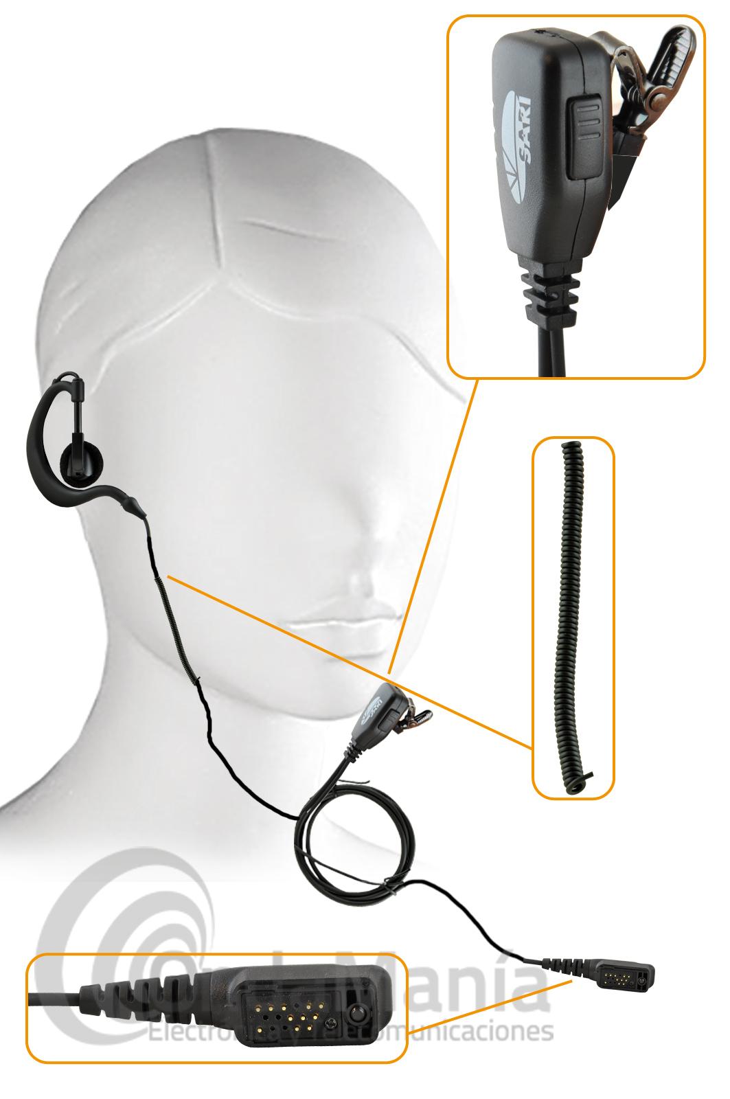 Pinganillo Sari TPH-900 compatible con el Airbus Tetrapol TPH-900, dispone de un auricular ergonómico con sujeción a la oreja y cable rizado, el micrófono dispone de un clip metálico y giratorio en la parte posterior. El cable es de color negro y en zonas rizado.