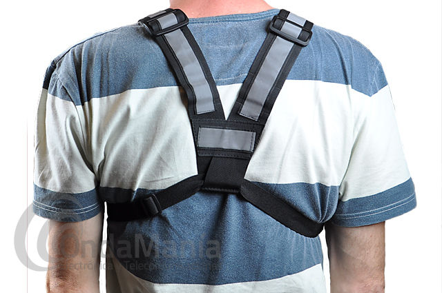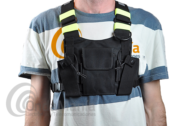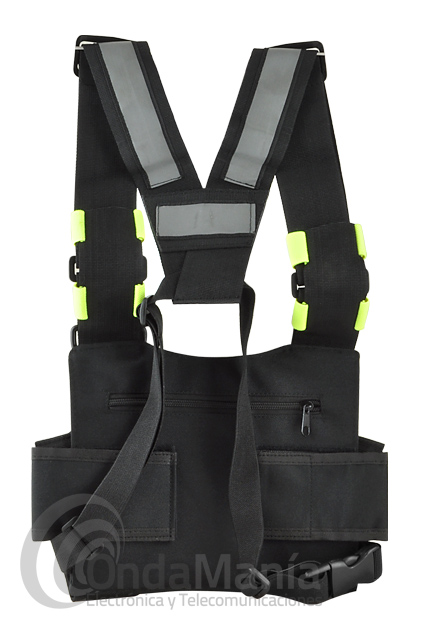 La HRT-LC-999-2 es una funda de nylon para pecho con dos tiritas reflectantes en cada tirante, dispone de tres huecos, dos de ellos están dispuestos para guardar walkys, teléfonos,..., incluye cierre y están el los laterales de la funda y en el otro hueco podemos meter otro walky, una cartera, herramientas,... este bolsillo se cierra con velcro y esta en el centro de la funda.