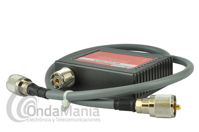 Duplexor con conectores PL y dos latiguillos con conectores PL machos, la frecuencia de cada latiguillo de salida es de 1.6 a 56 Mhz y de 140 a 470 Mhz con una potencia máxima de 600 W.