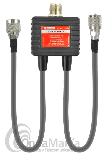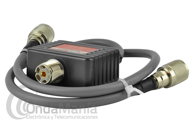 Duplexor con conector de entrada “PL” y dos salidas con dos cables uno con conector “PL” y otro con conector "N" para unas frecuencias comprendidas entre 1,6 a 150 Mhz. y una potencia de 400 W max. y 400 a 460 Mhz. y una potencia de 240 W..