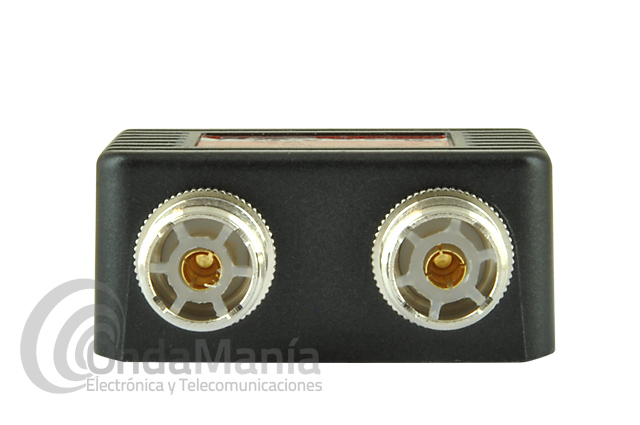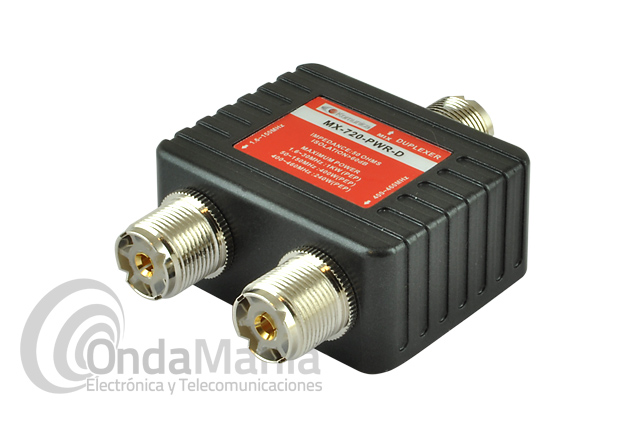 Duplexor con conector de entrada“PL” y dos salidas con conectores “PL” con unas frecuencias comprendidas entre 1,6 a 150 Mhz. y 400 a 460 Mhz. con una potencia máxima de 300W y sin cables.
