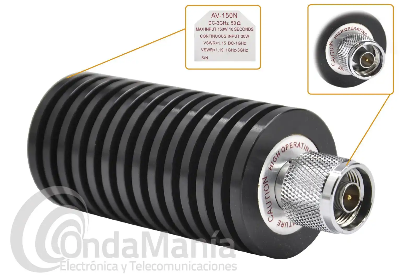 Carga ficticia Komunica PWR-DL-150N, con un margen de frecuencia de hasta 3 Ghz y una potencia máxima de 30 W continuos y 150 W de pico.