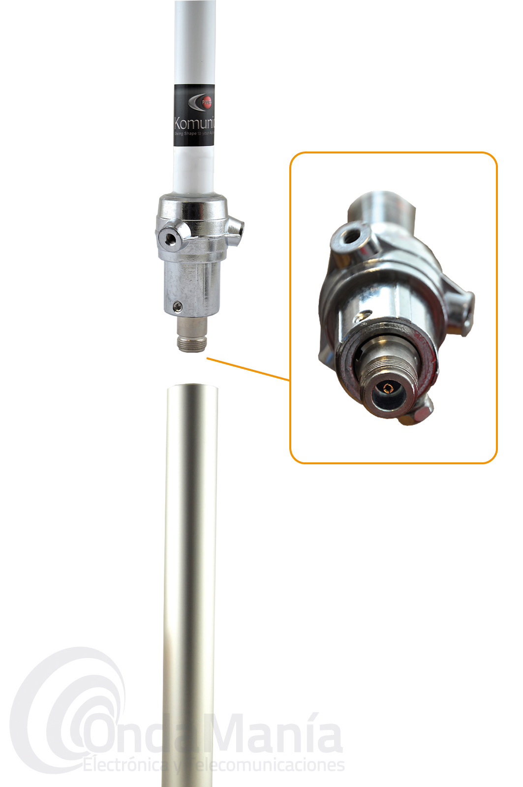 Antena de fibra de vidrio en dos tramos con una longitud de 2500 mm par las bandas de 50, 144 y 430 Mhz, con una ganancia de 2,15 dBi en VHF y de 8,4 dBi en UHF, con una potencia máxima de 350 W.