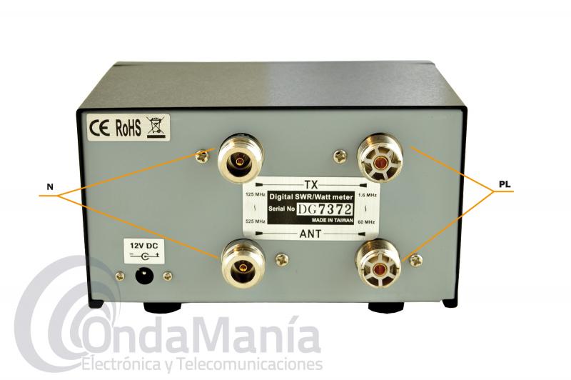 Medidor de ondas estacionarias ROE y watimetro digital de alta calidad con un rango de frecuencia de 1,6 a 60 Mhz y de 125 a 435 MHz, con un rango de potencia de 0 a 200 W y con dos conectores tipo N y PL hembras en su parte posterior, incluye cable de alimentación a 12 V.
