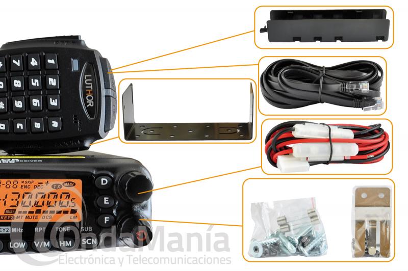 Incluye: Emisora Luthor TLM-808, micrófono con teclado DTMF, soporte de montaje, cable de alimentación con fusible, cable de separación de panel frontal, soporte de montaje del panel frontal, conjunto de tornillos, fusibles de protección y manual de instrucciones.
