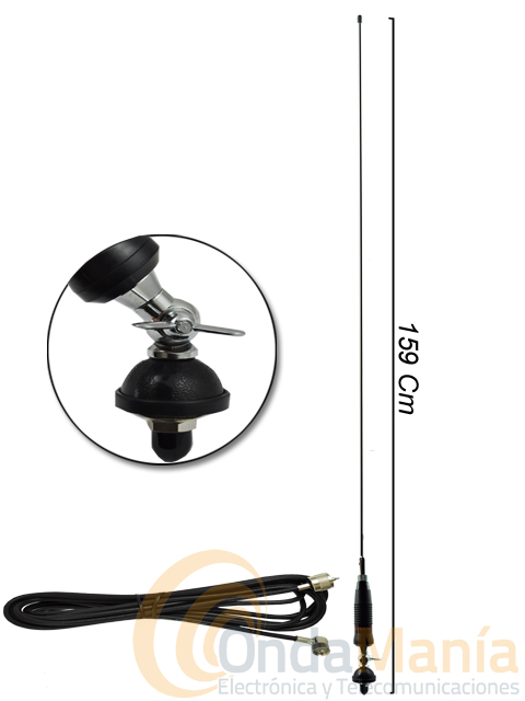 Antena de móvil para 27 Mhz con base de palomilla y varilla de acero inoxidable. Gracias a su base de palomilla podemos ajustar el angulo para que la antena quede vertical. Icluye cable RG-58 con conectores en su extremo uno para la base y otro PL para el transceptor.